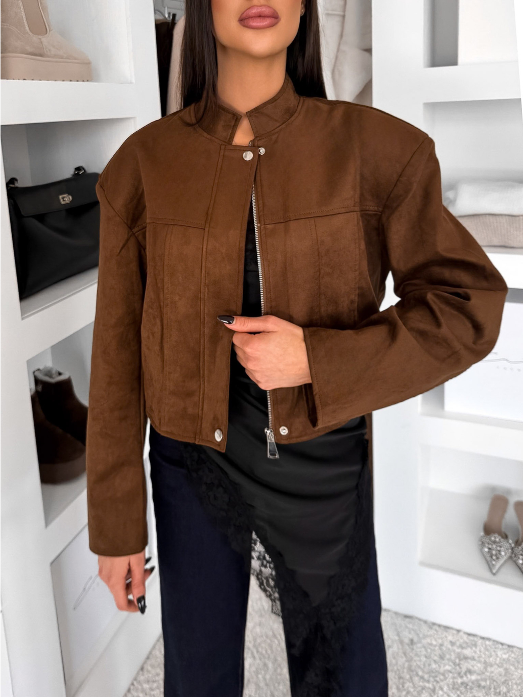 Tmavě hnědá koženková biker bunda YOBARI