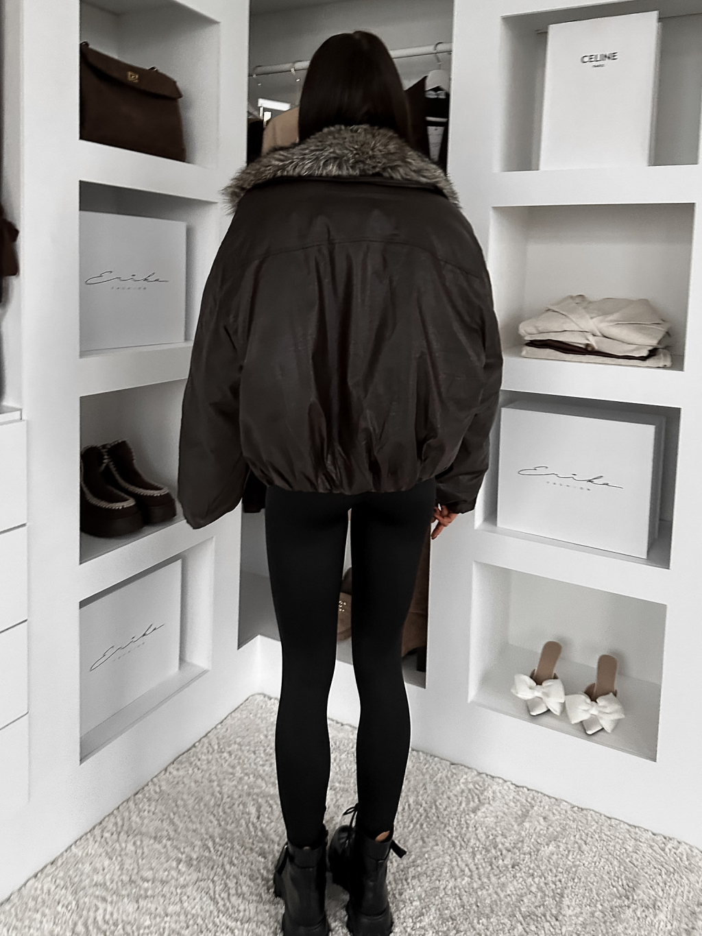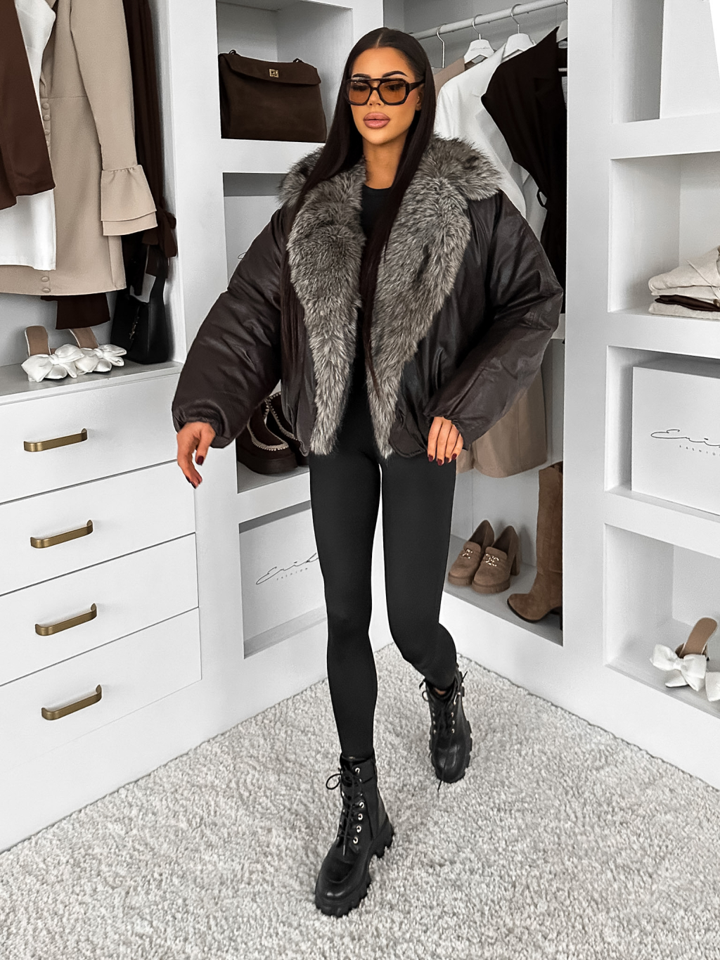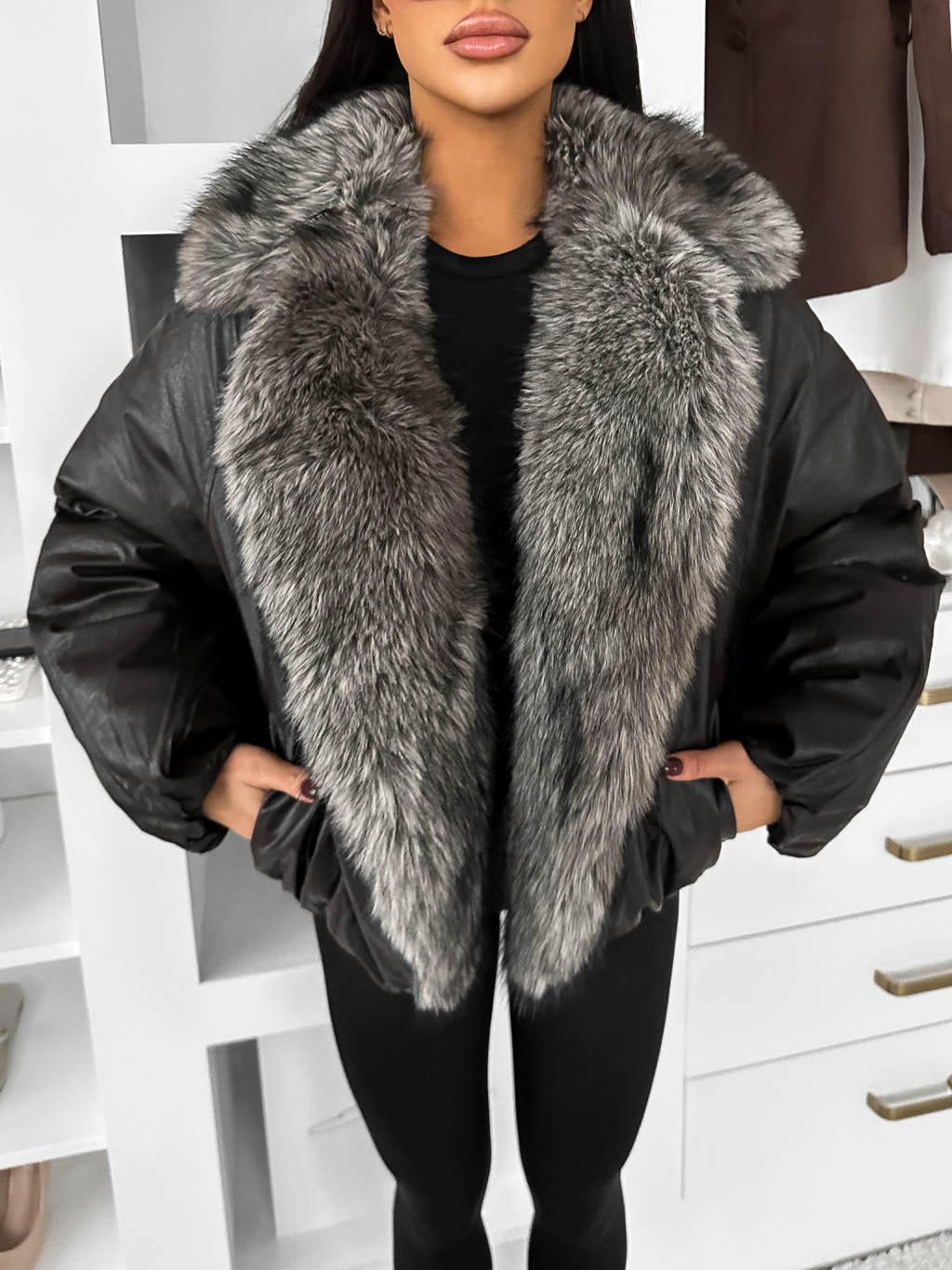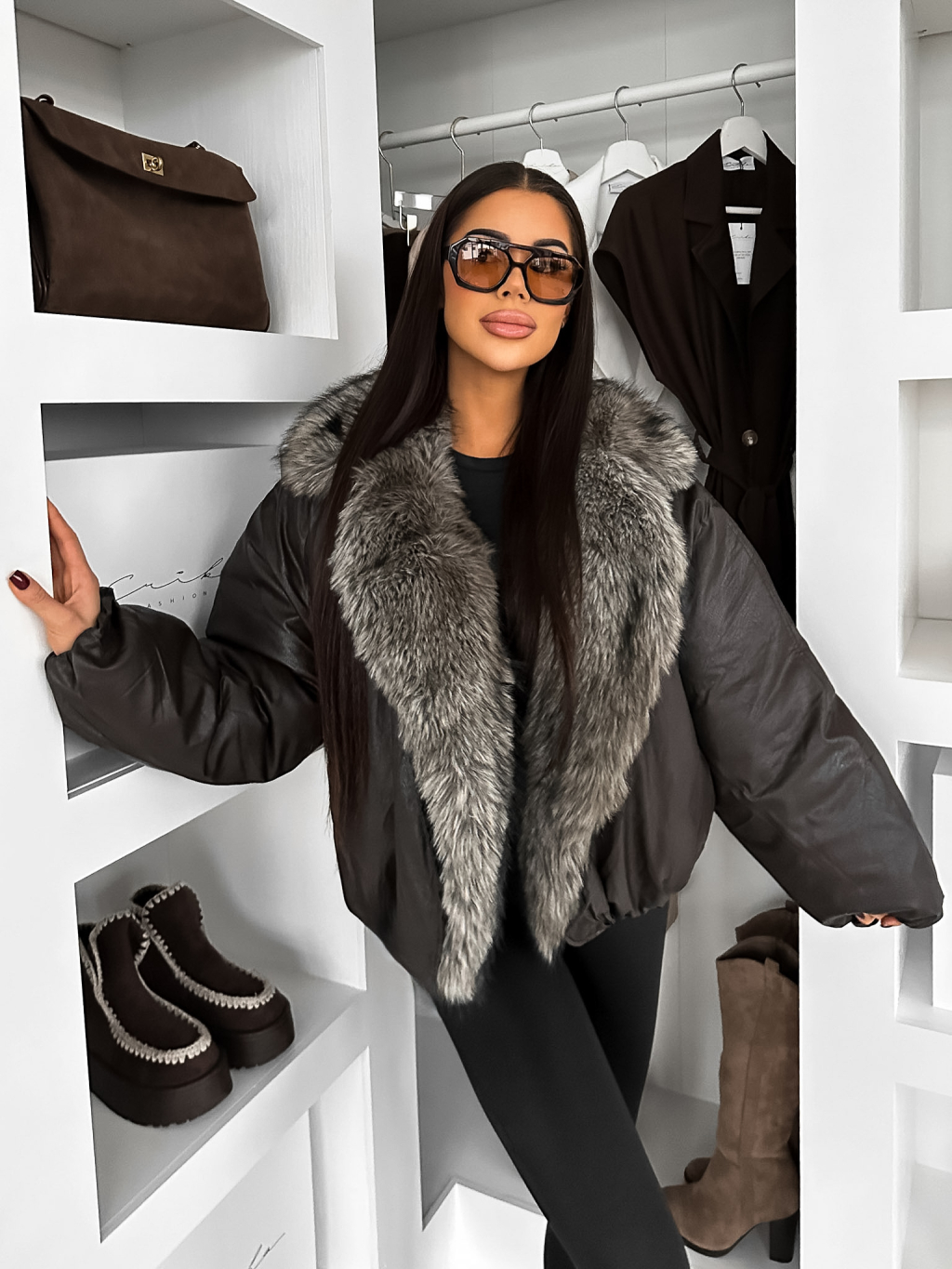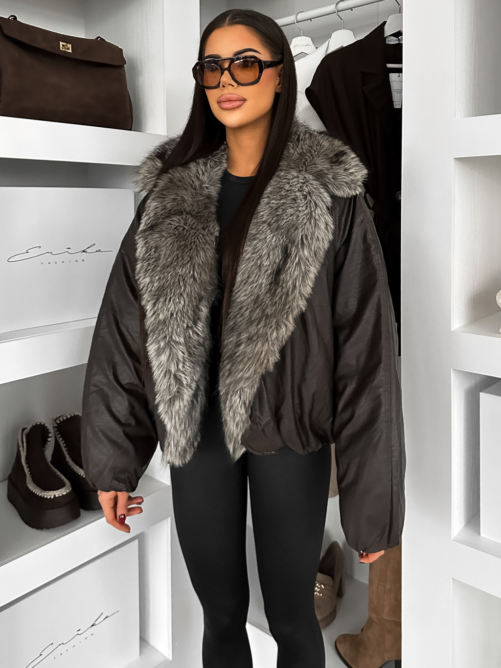 Tmavě hnědá koženková bunda NUVIRA s kožešinou