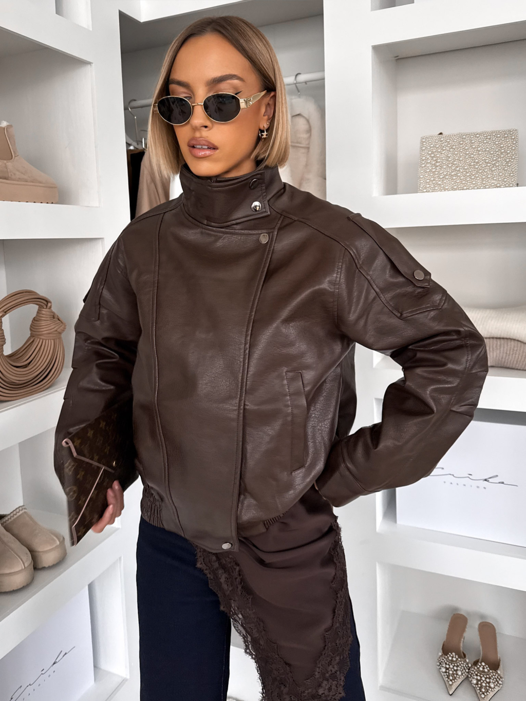 Tmavě hnědá koženková krátká bunda AUBET
