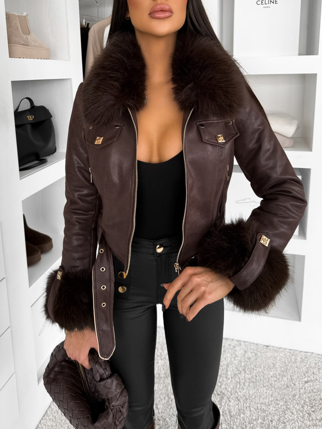 Tmavě hnědá krátká biker bunda EMBRILA s kožešinkou