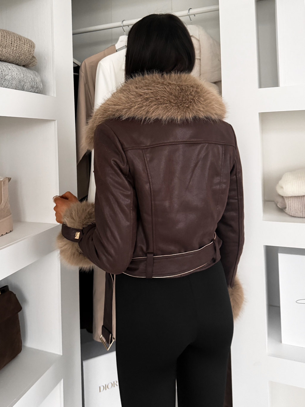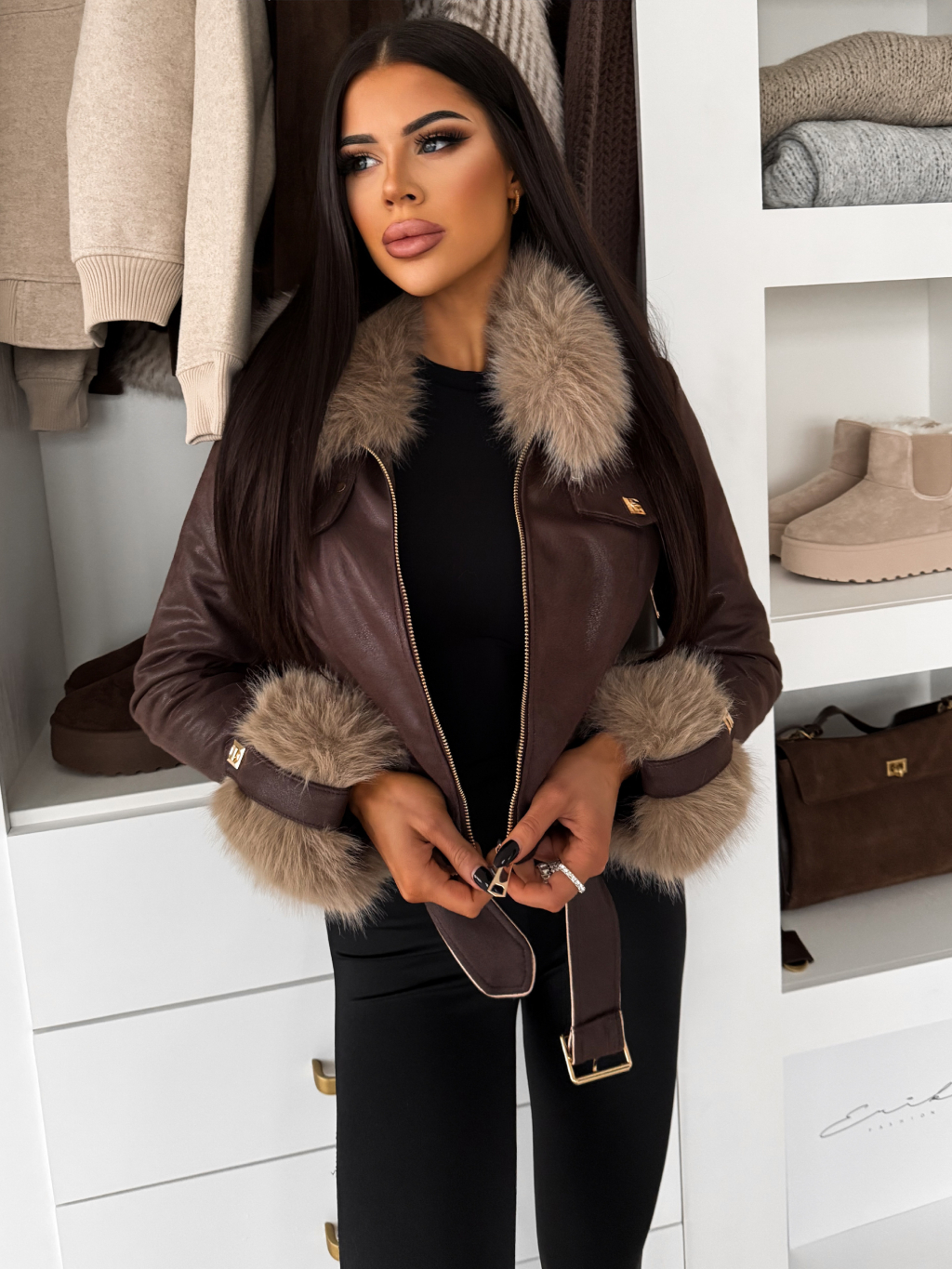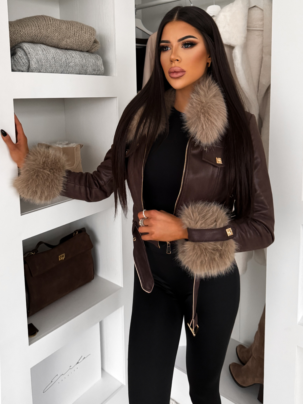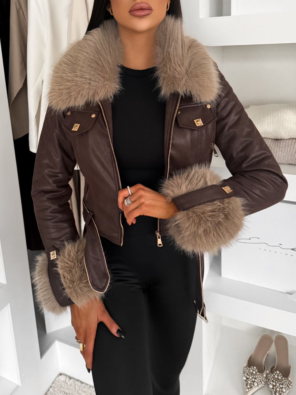 Tmavě hnědá s krémovou krátká biker bunda EMBRILA s kožešinkou