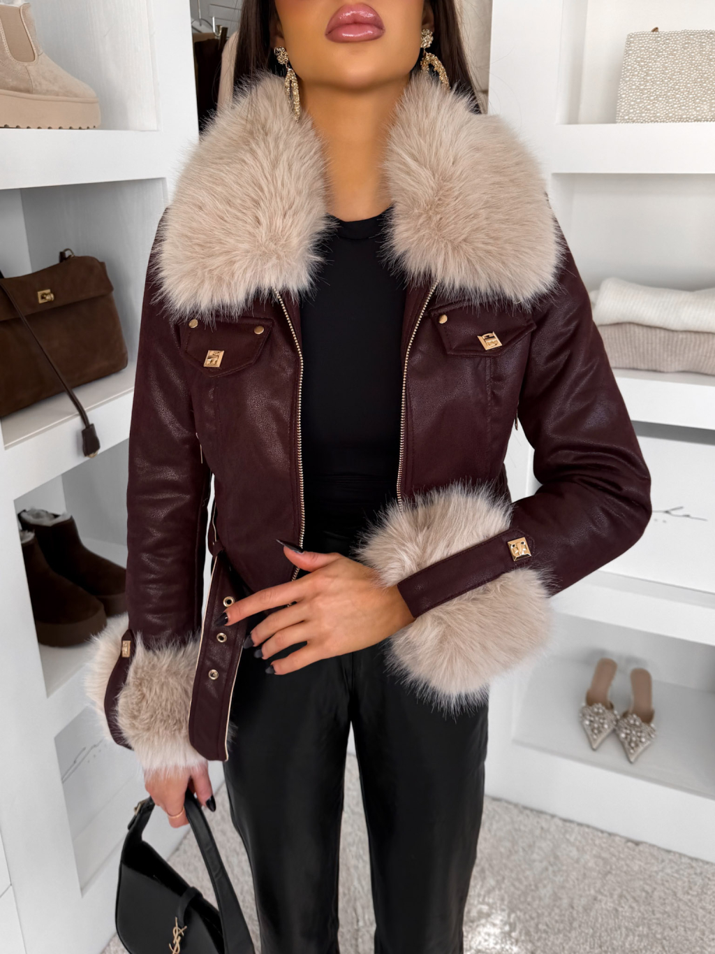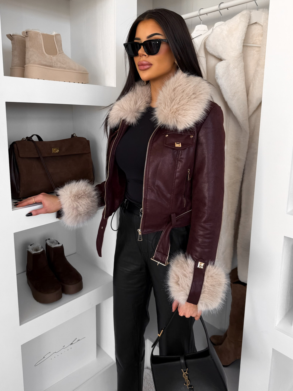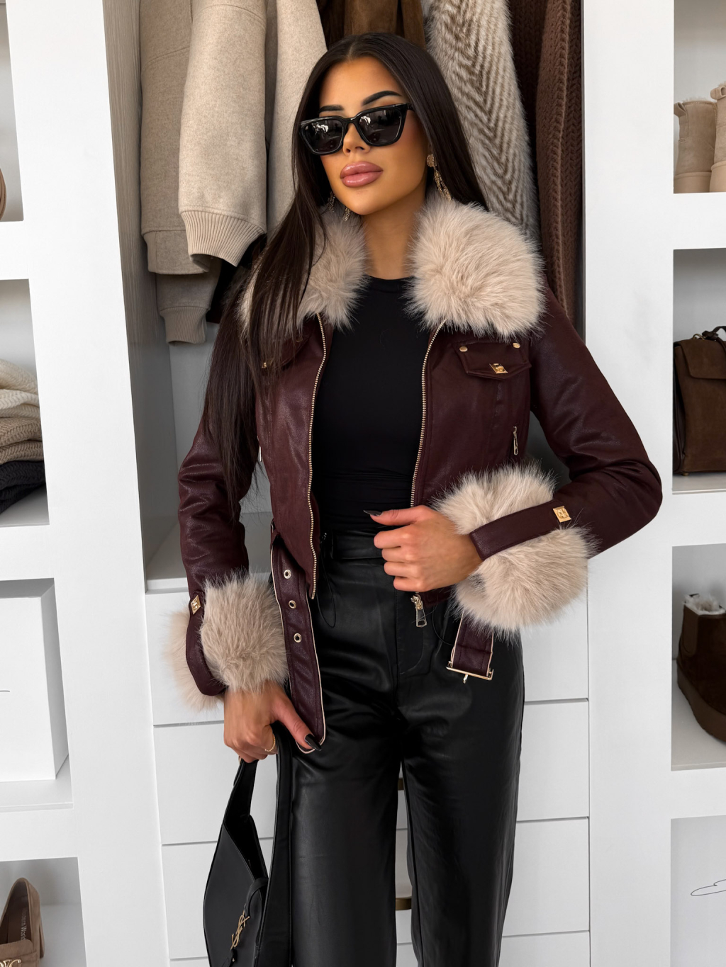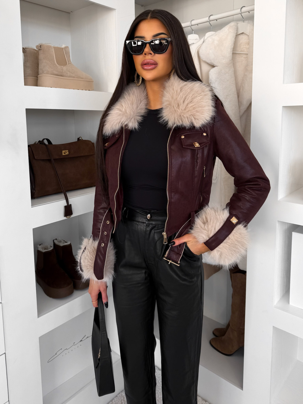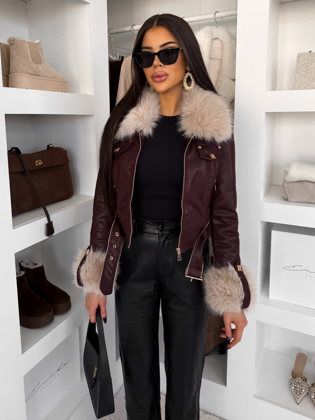 Vínová krátká biker bunda EMBRILA s kožešinkou