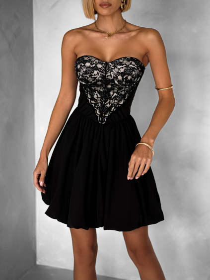 Černá saténová krajková dlouhá košilka šaty ARVENE