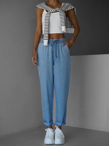 Pro elegantní outfit vyzkoušej kombinaci letních kalhot s lněnou košilí a sandály na nízkém podpatku nebo kožené žabky. Pokud dáváš přednost spíše ležérnímu looku, oblékni k letním kalhotám basic tričko, denimovou bundu a tenisky.
