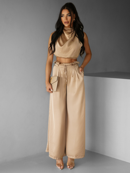 Béžový kalhotový komplet MAXENA s překříženým topem