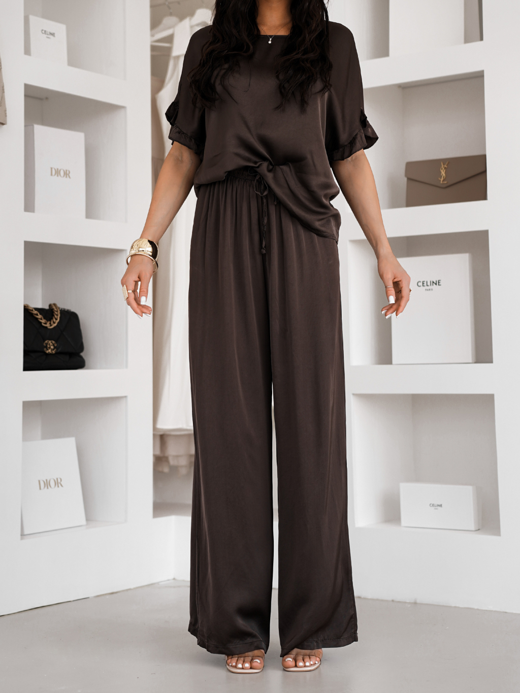 Tmavě hnědé široké saténové kalhoty PULSINA