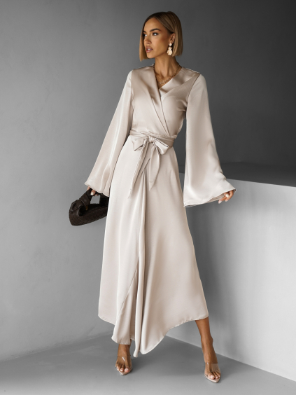 Tmavě béžové dlouhé lesklé šaty MADES se zavazováním