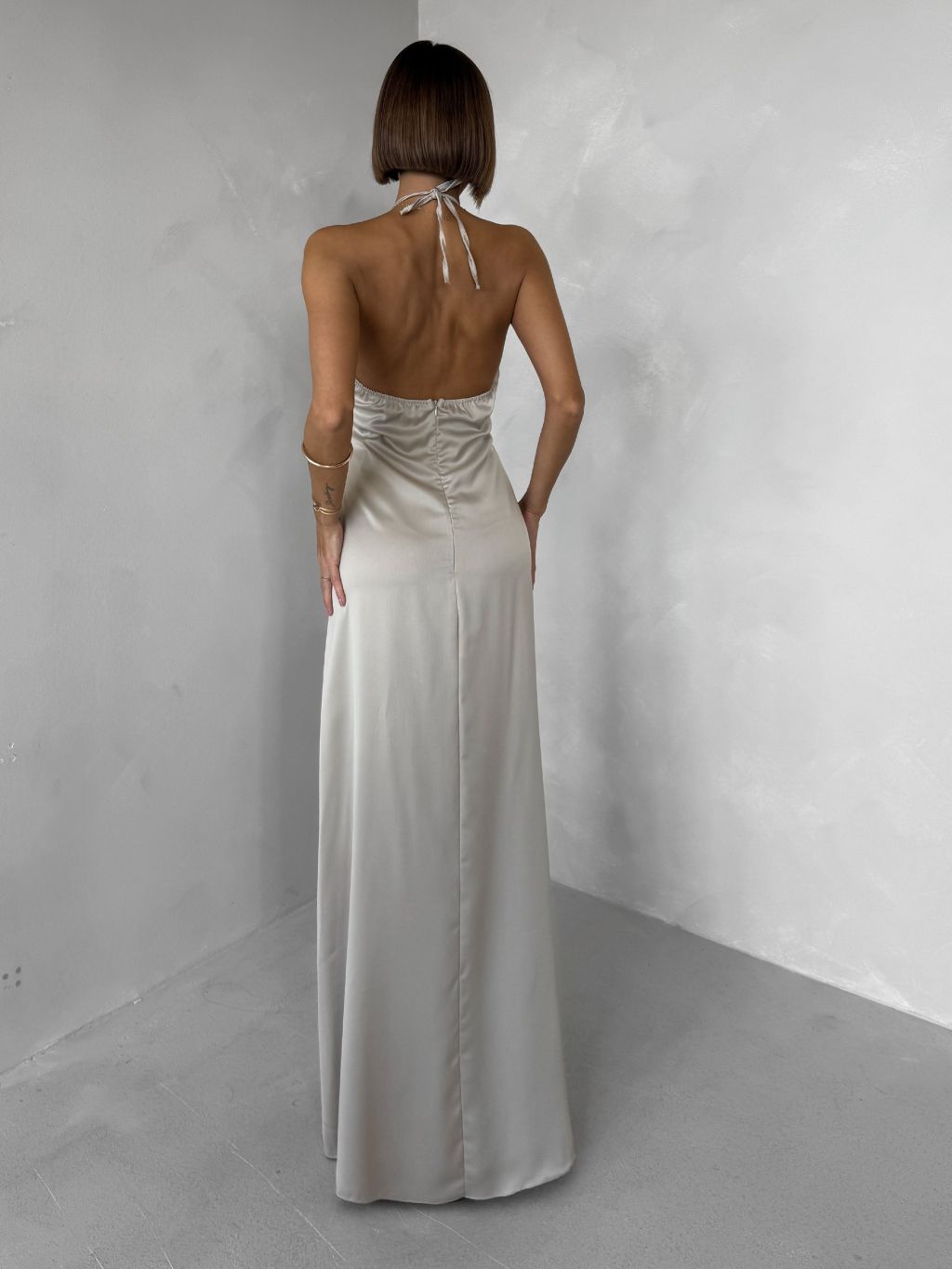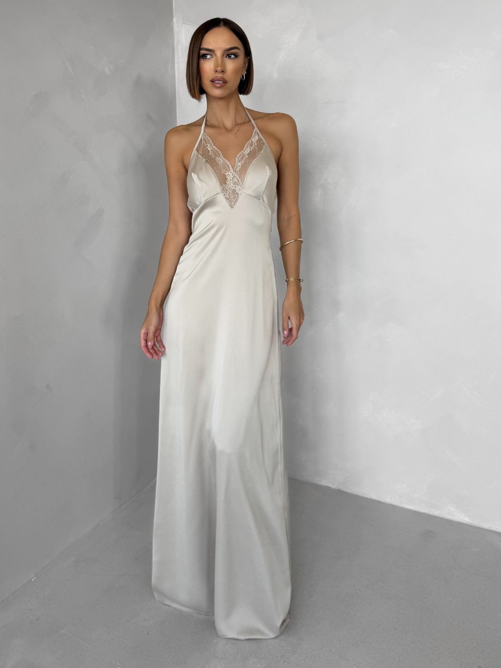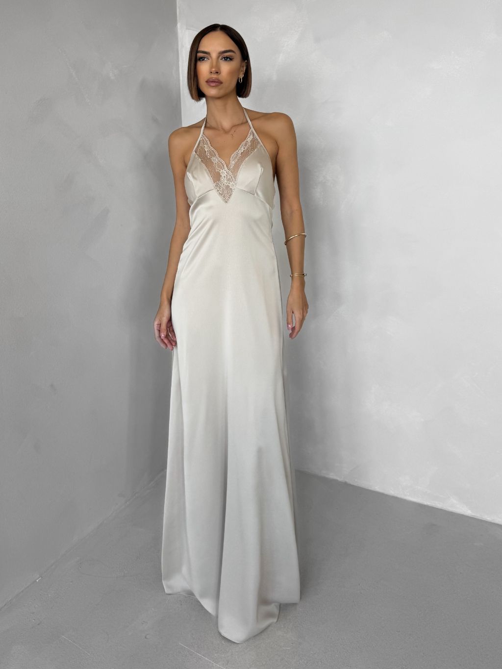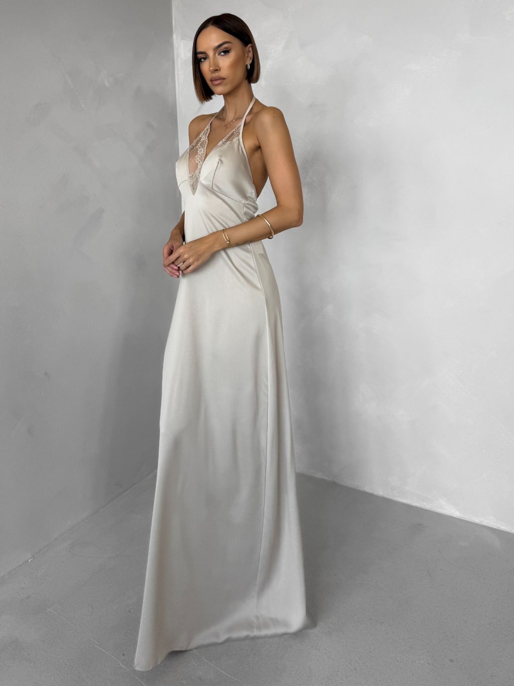 Béžové dlouhé saténové šaty FORTYK s krajkou