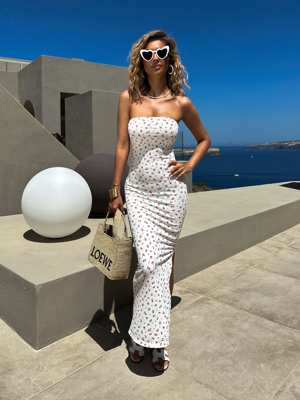 Bílé dlouhé kytičkované šaty ELYAS bez ramínek