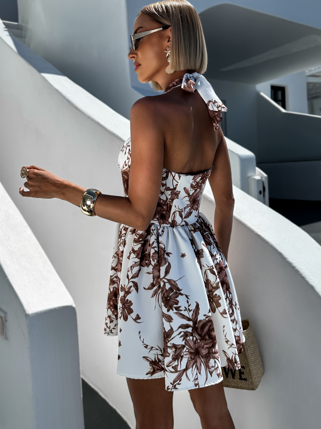 Bílohnědé krátké letní vypasované šaty LAURA