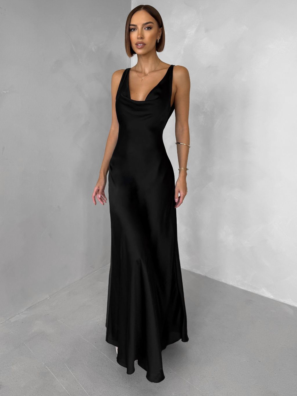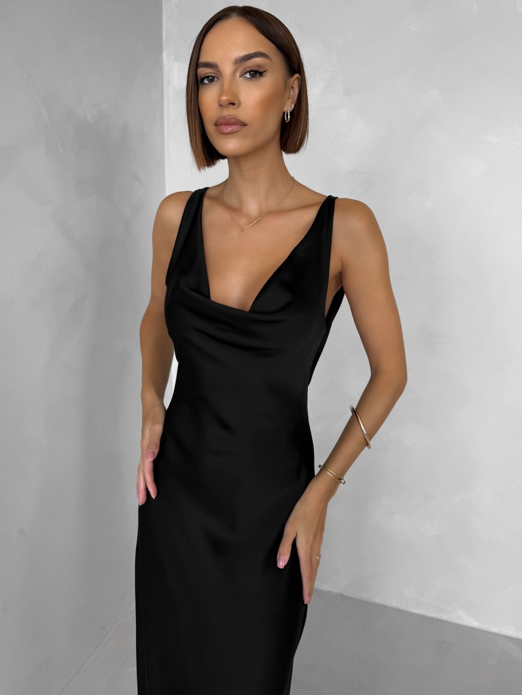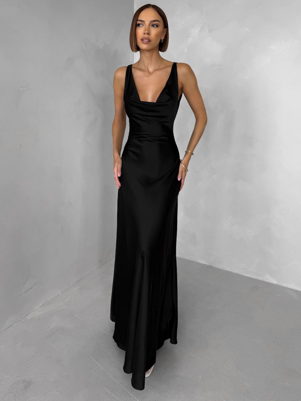 Černé saténové dlouhé šaty MIREVE s odhalenými zády