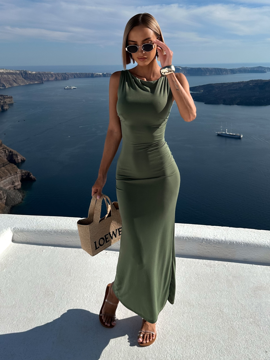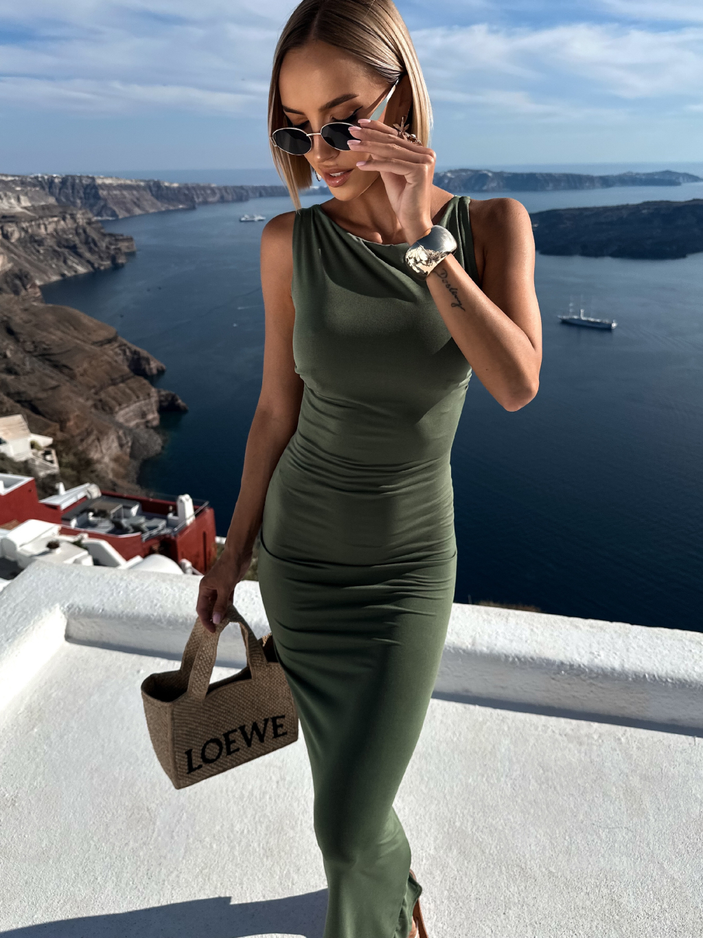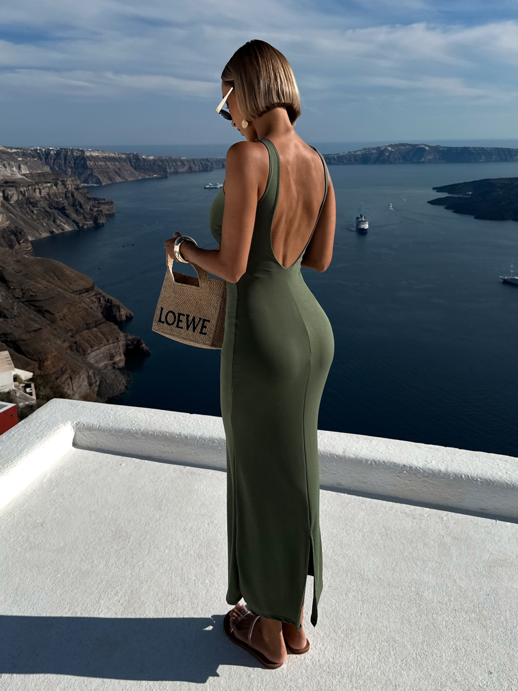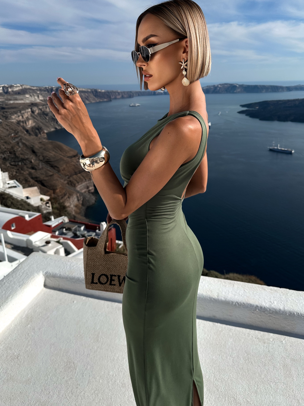 Khaki dlouhé letní šaty KEENAN s holými zády