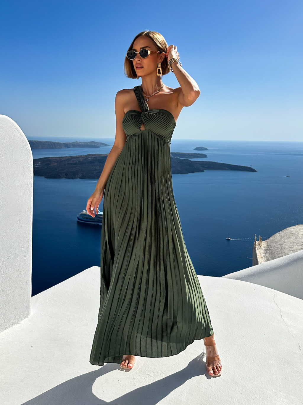 Khaki elegantní šaty TOKIA přes jedno rameno