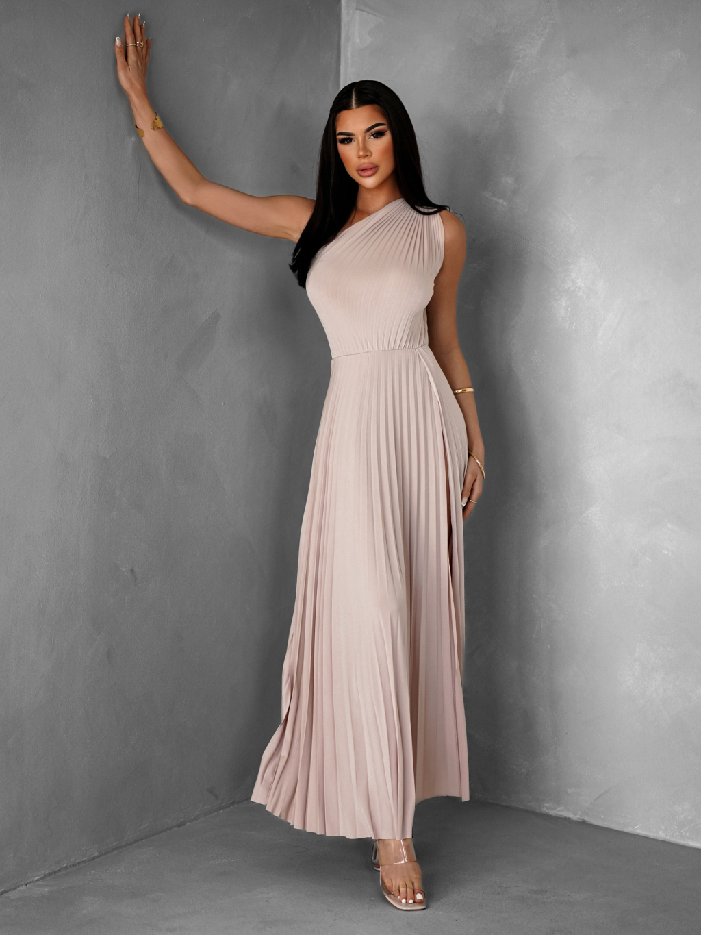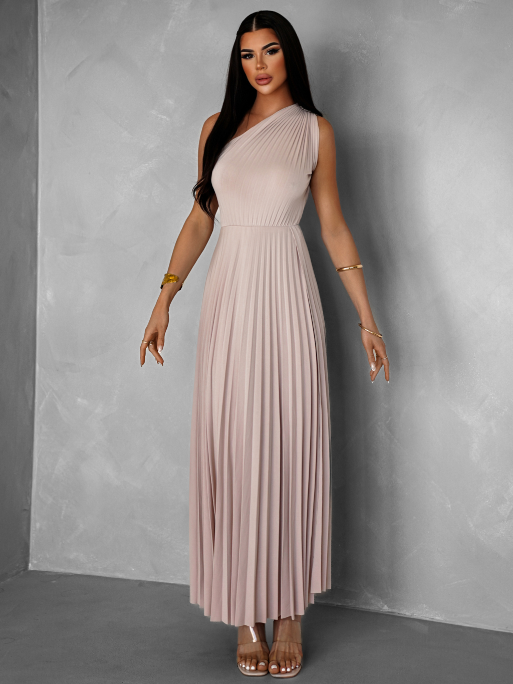 Krémové asymetrické plisované šaty OLIVIE