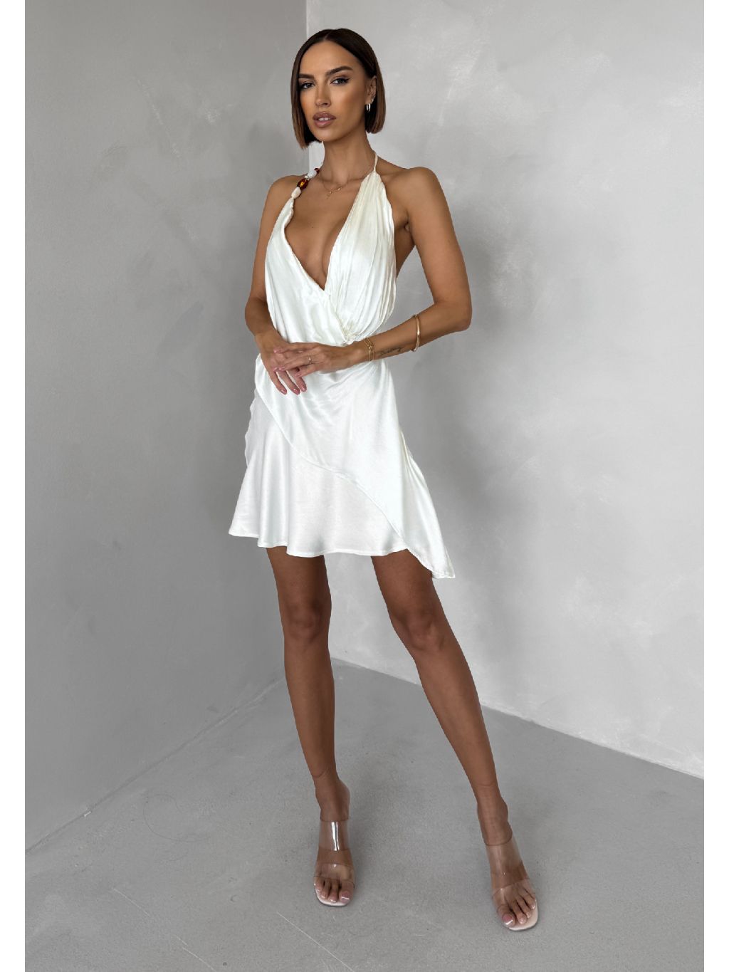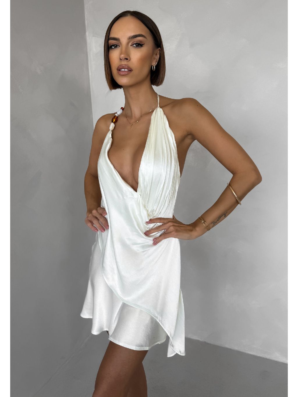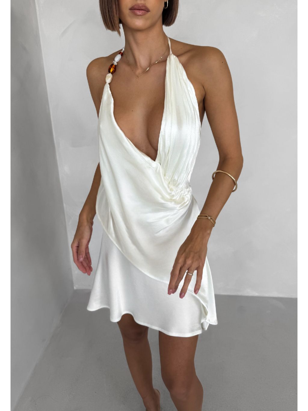 Krémové krátké koktejlové saténové šaty AMESTIA