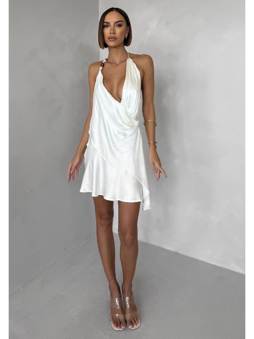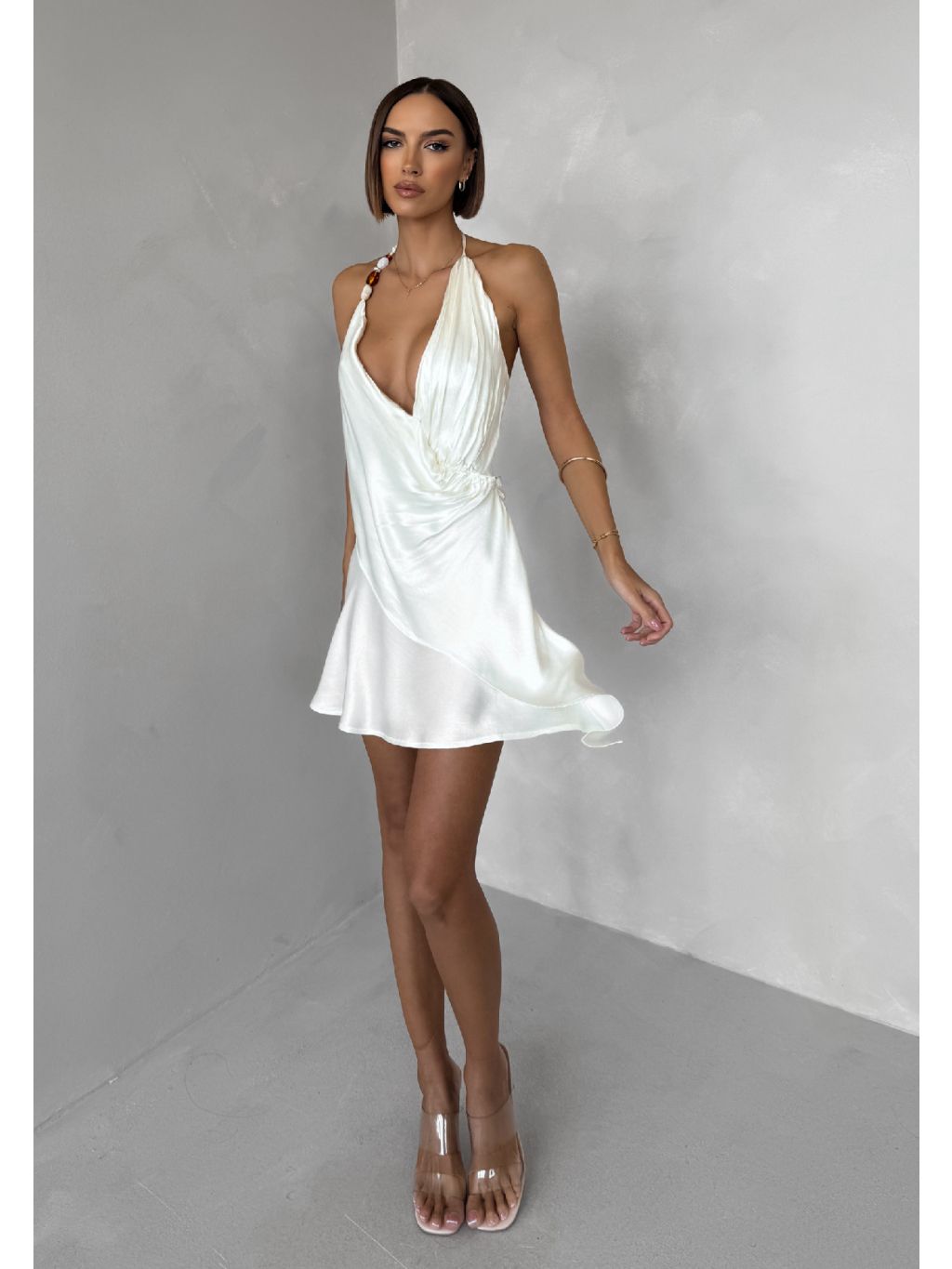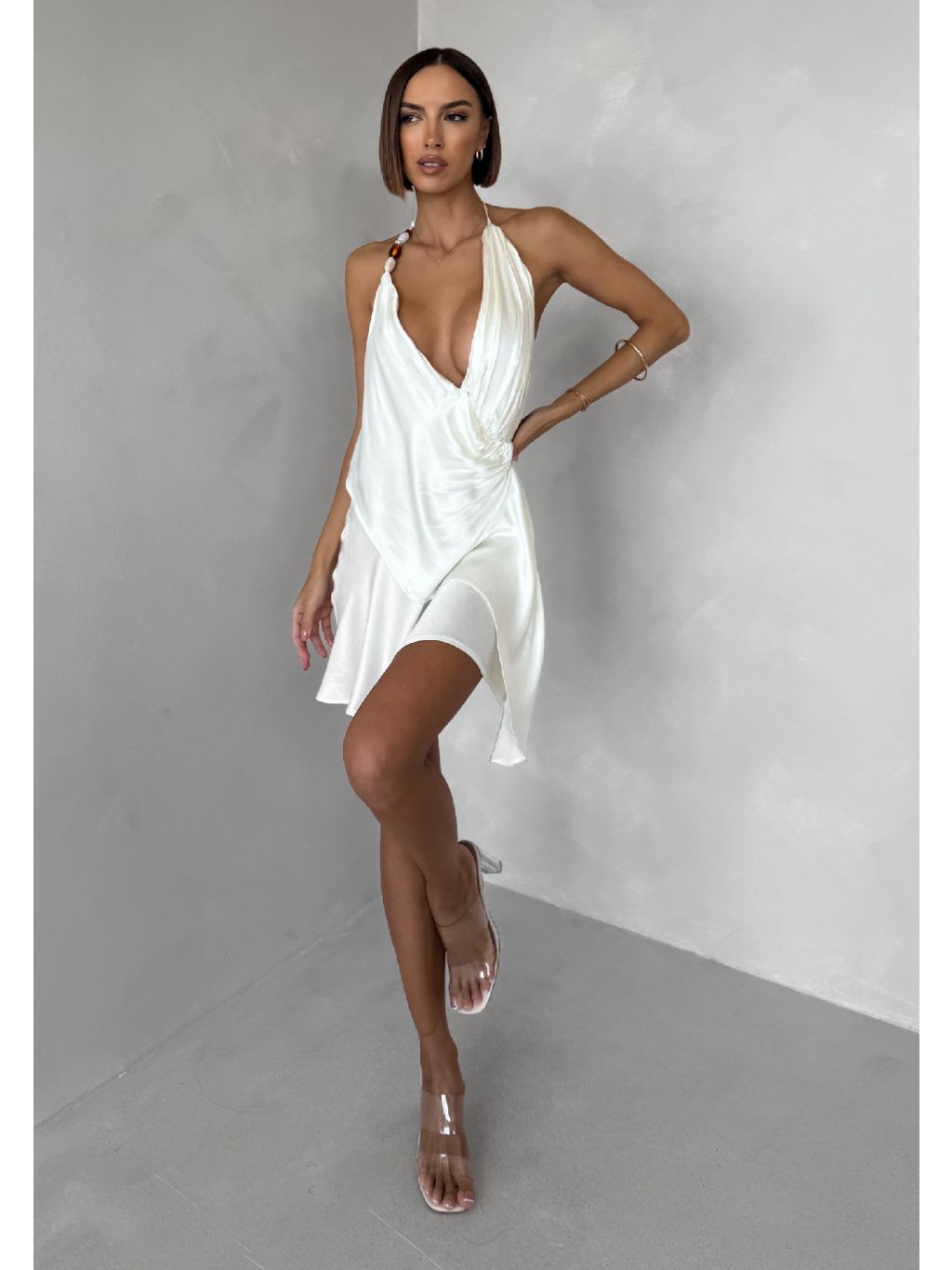Krémové krátké koktejlové saténové šaty AMESTIA