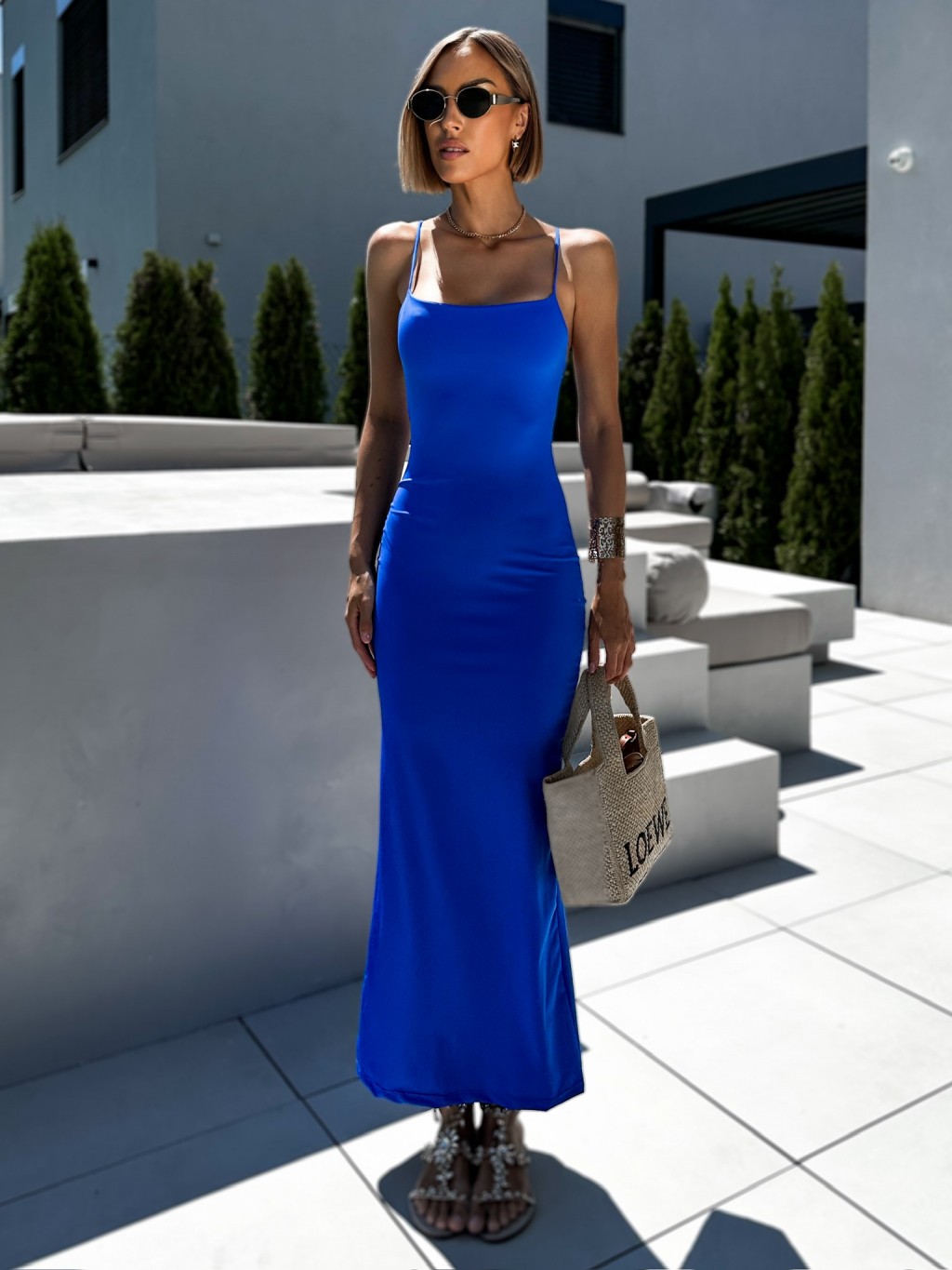 Modré dlouhé úzké šaty ARGIRIS na špagetová ramínka