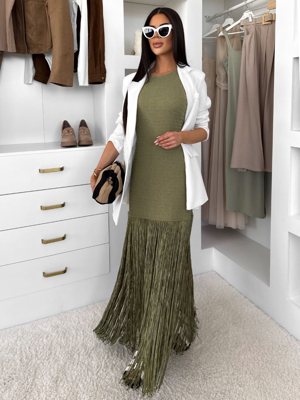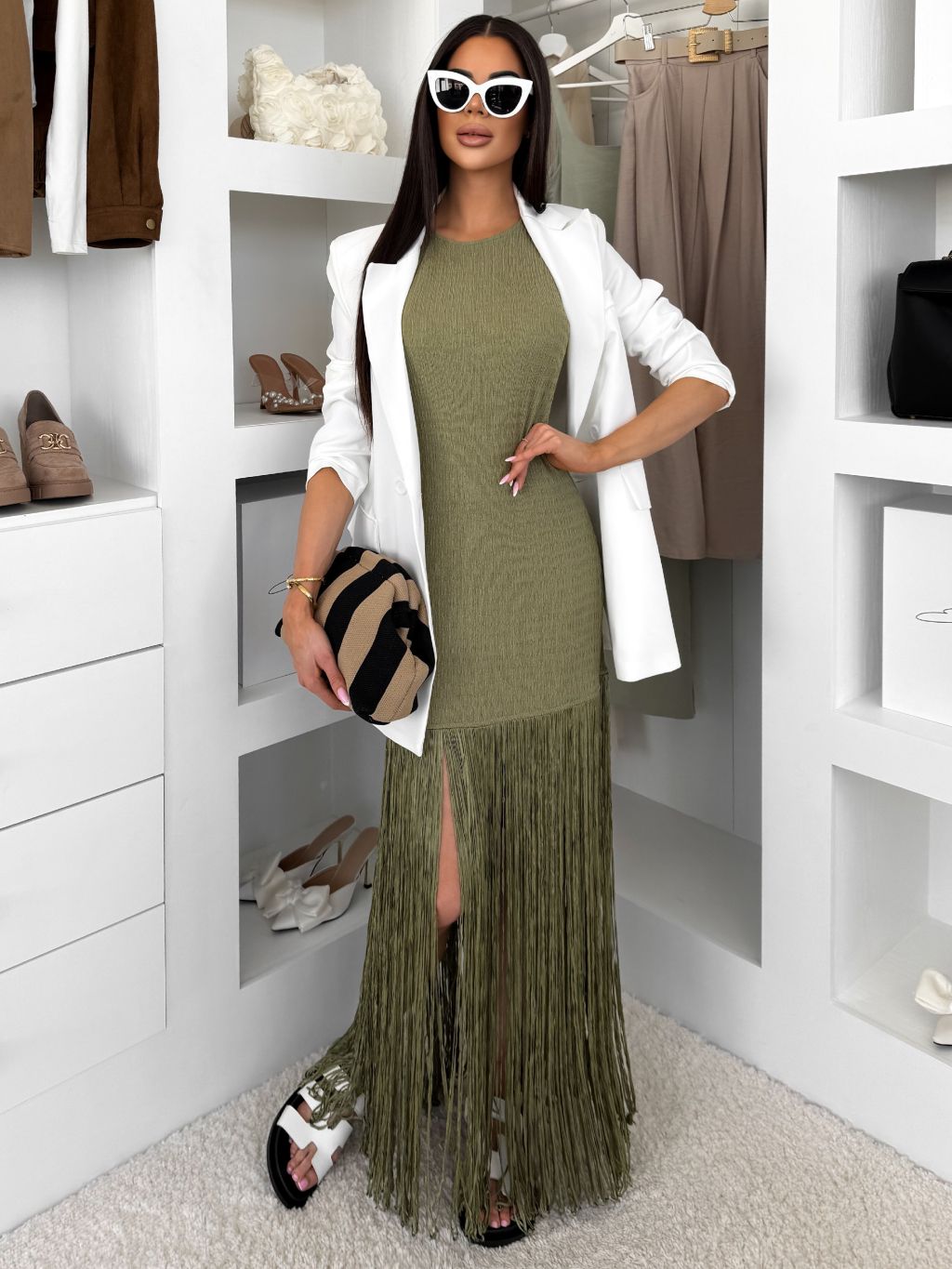 Olivové dlouhé šaty CYLARA s třásněmi