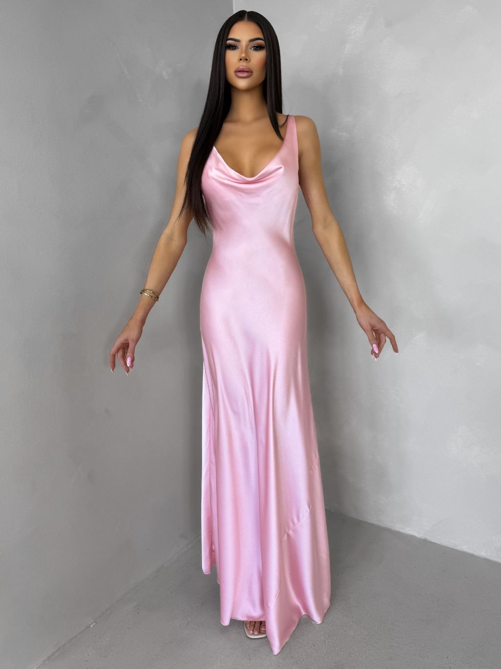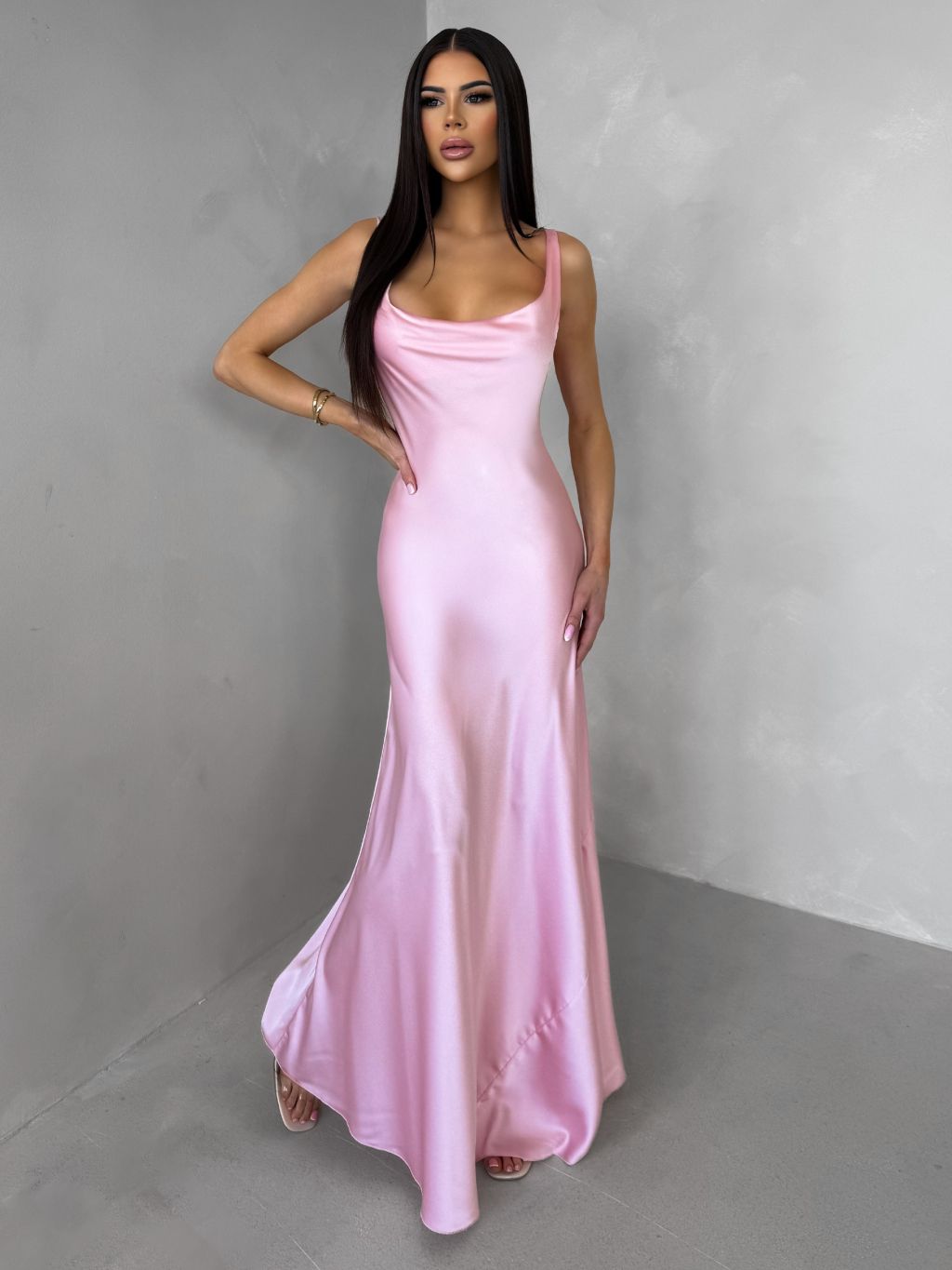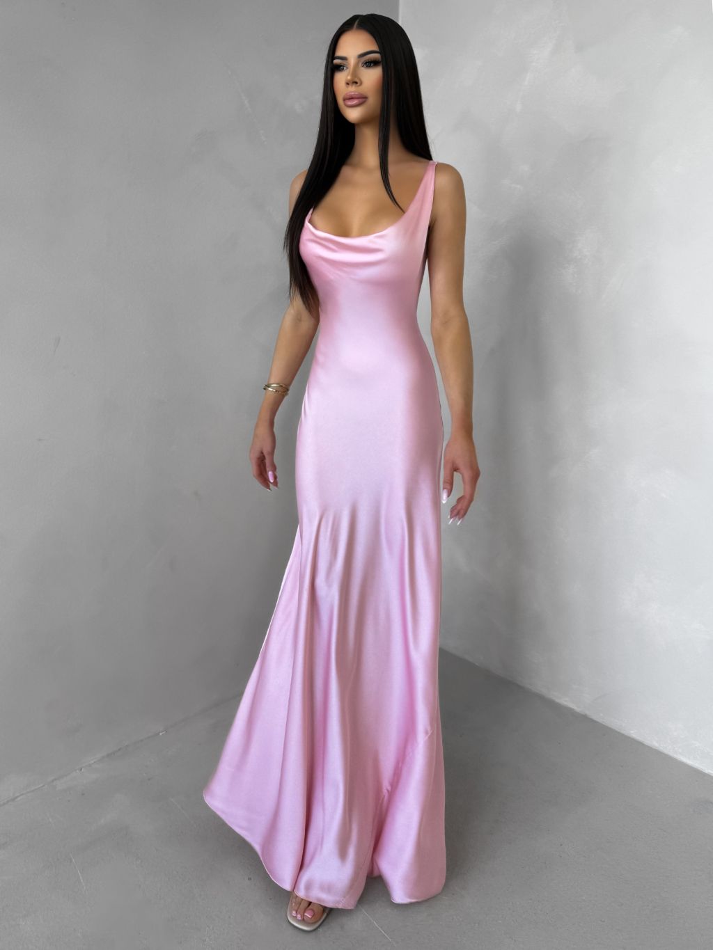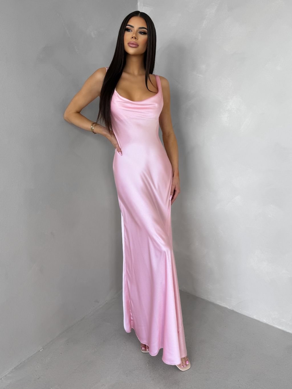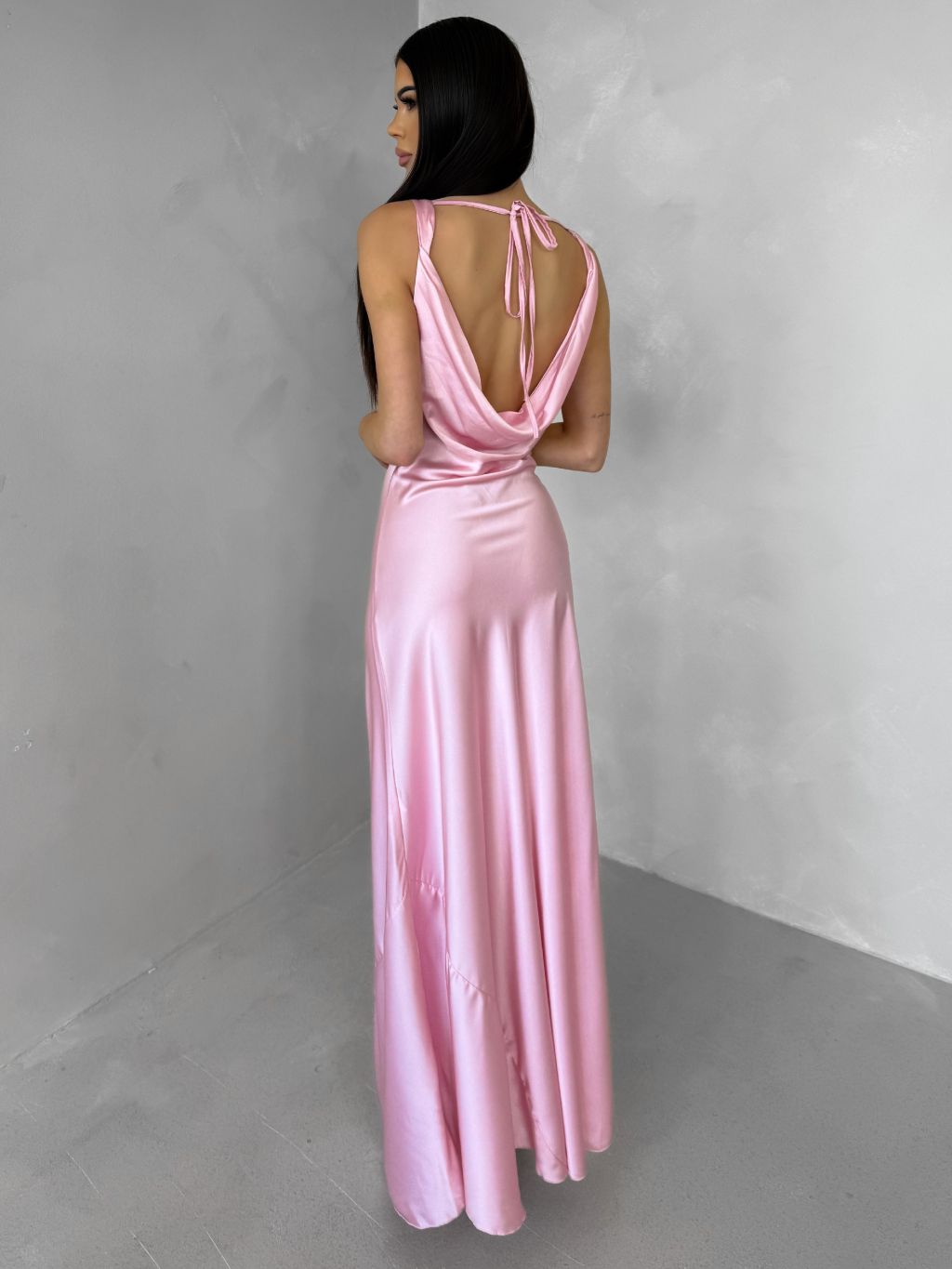 Růžové saténové dlouhé šaty MIREVE s odhalenými zády