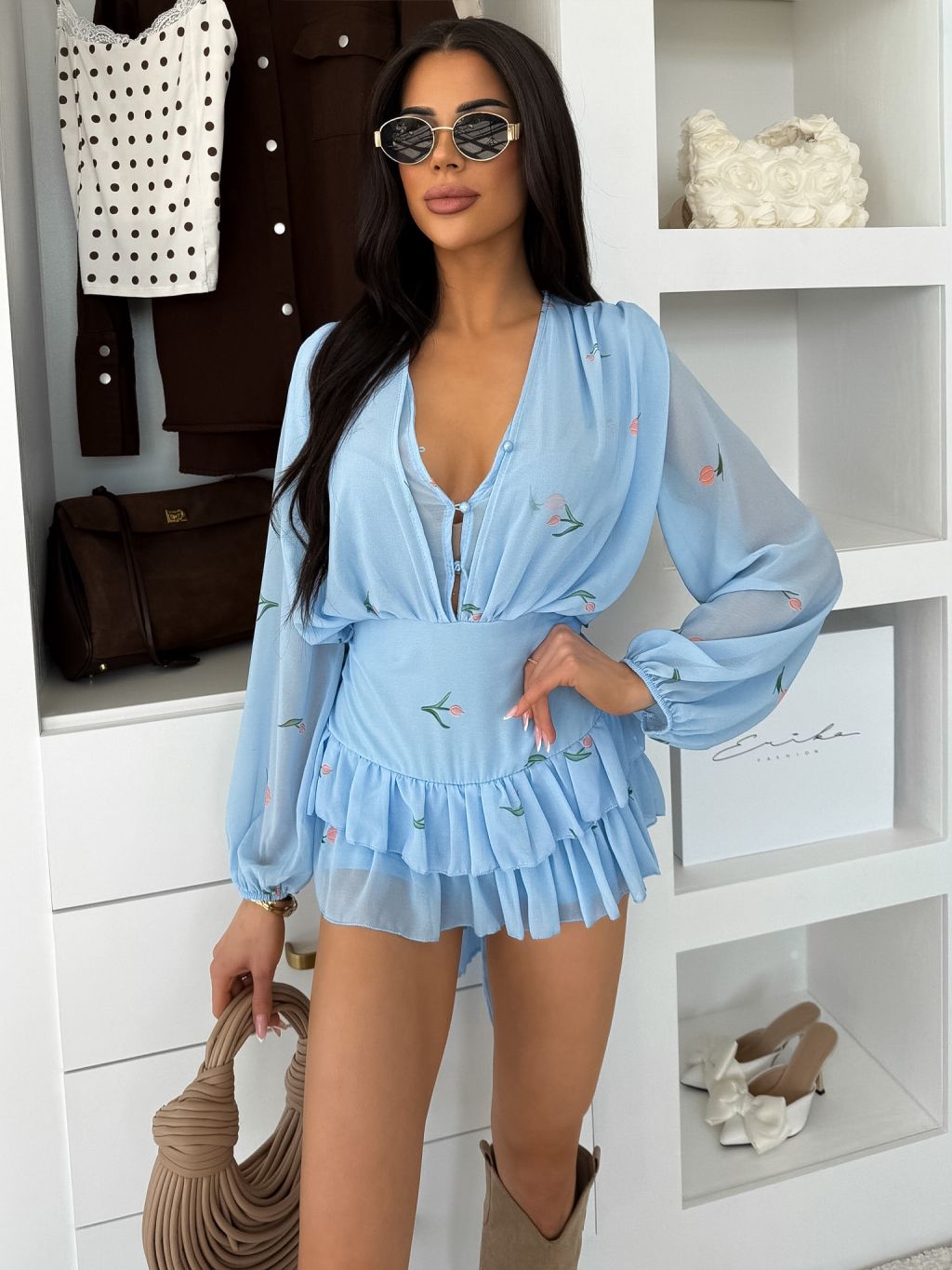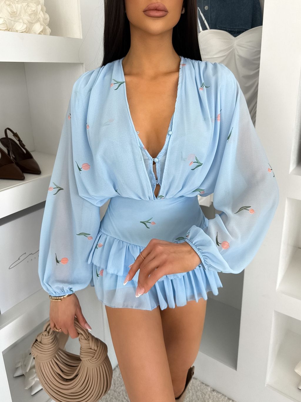 Světle modré krátké šifonové květované šaty LIREA s kraťásky