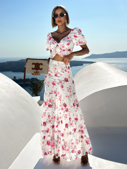 Bílohnědá letní midi sukně FAKLAR s květinami