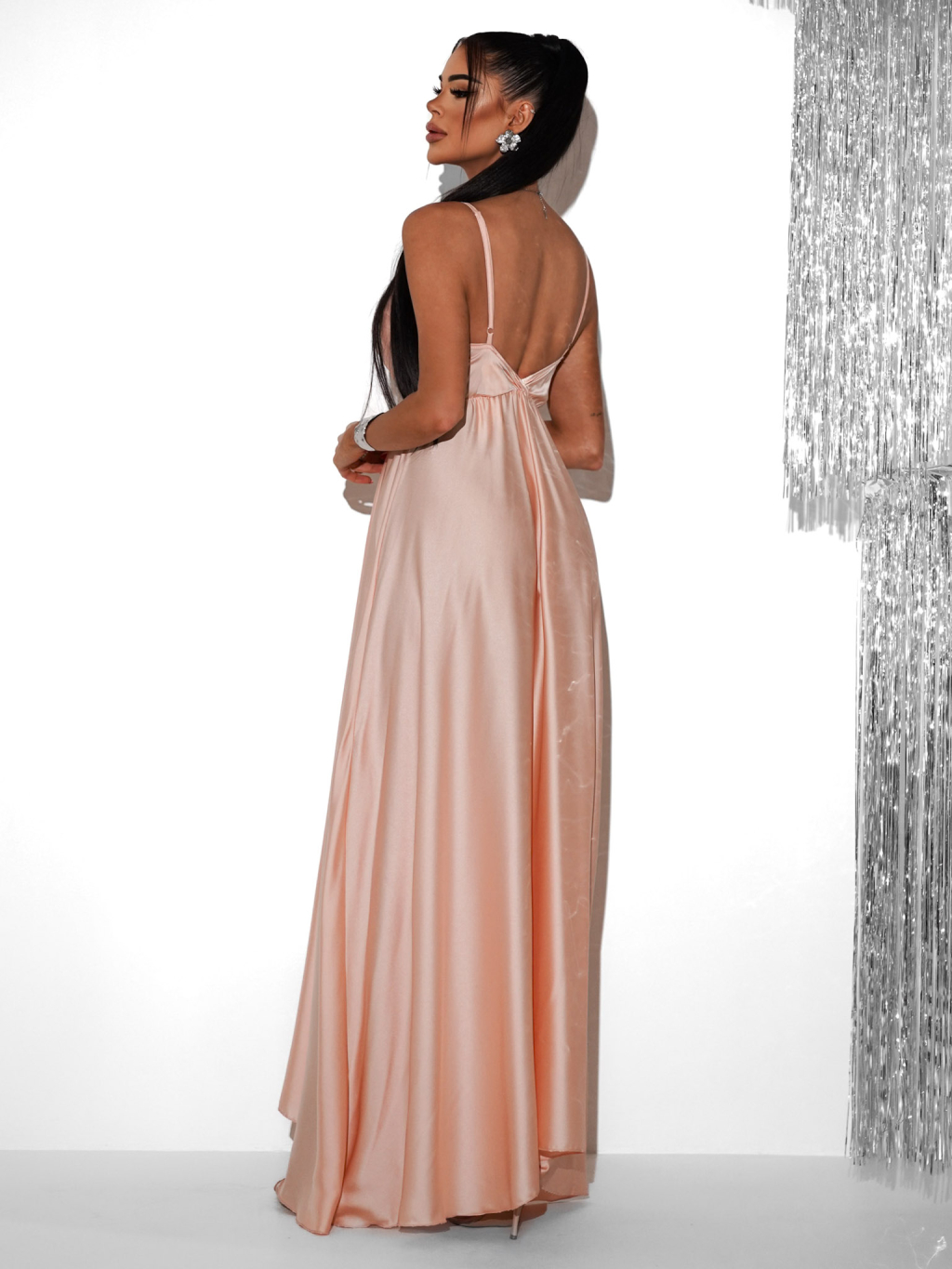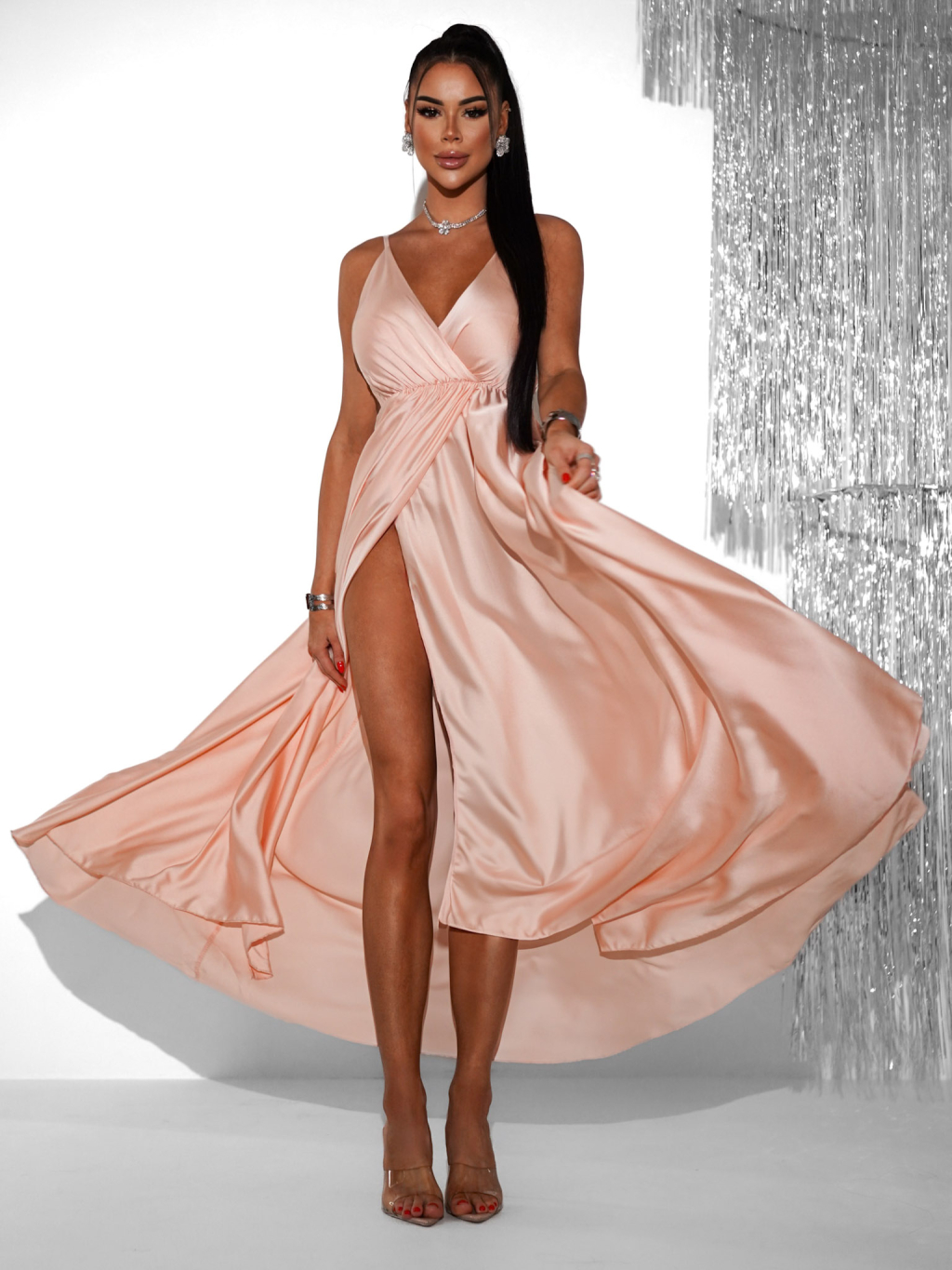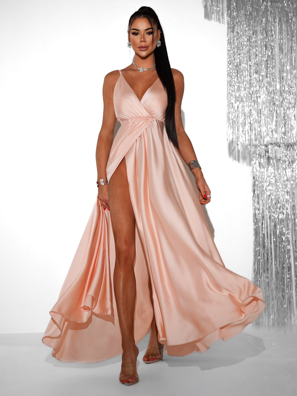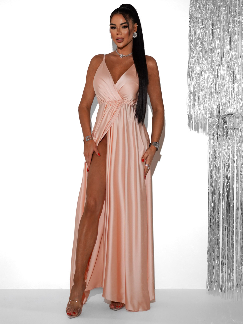 Světle růžové dlouhé lesklé šaty PERFECTLY s výstřihem