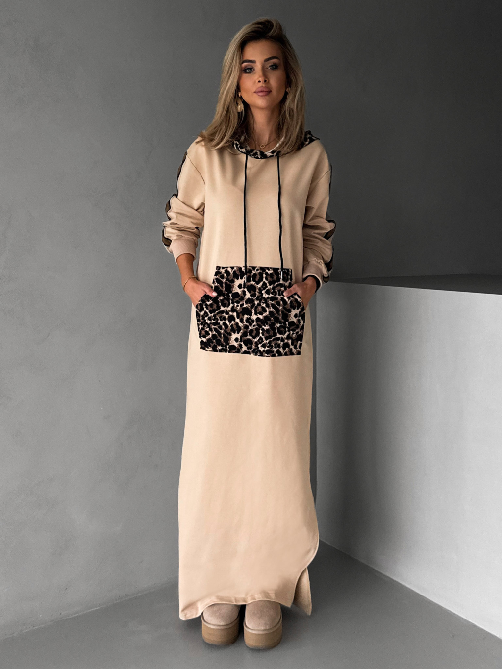 Béžové mikinové maxi šaty ZOWIE s leopardím vzorem