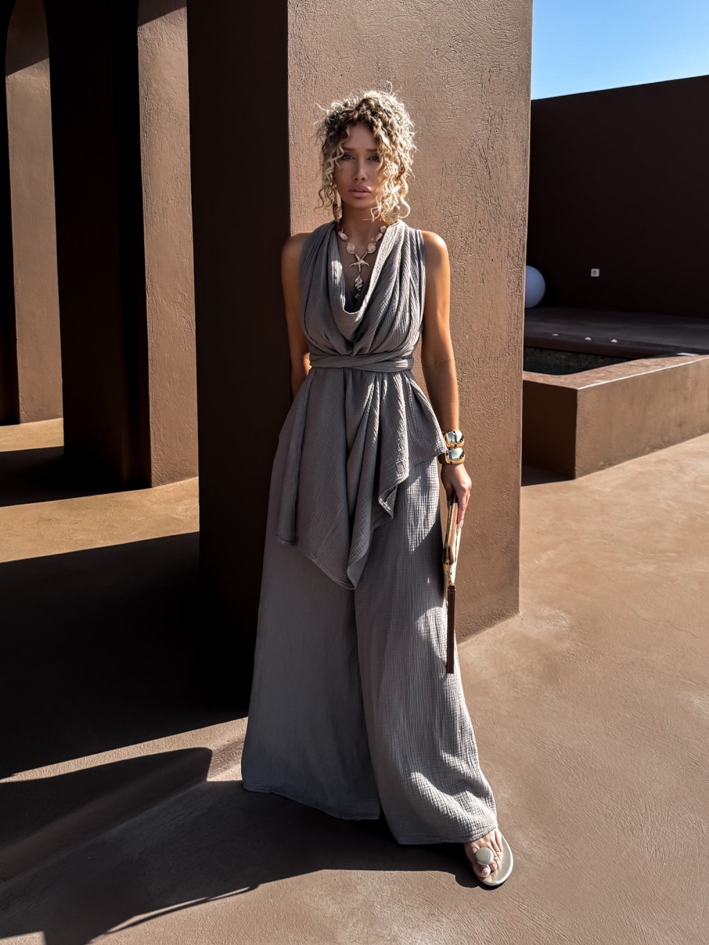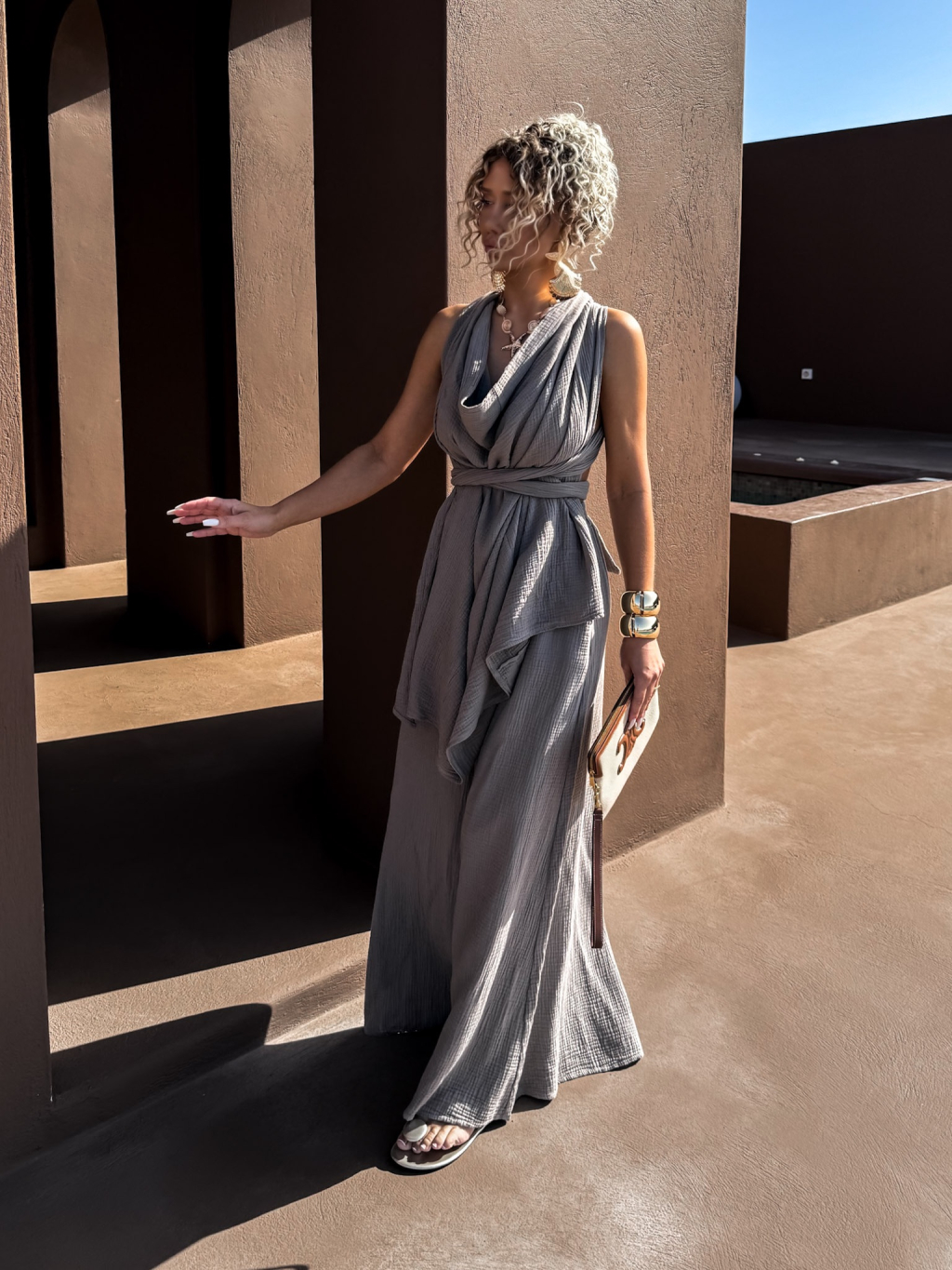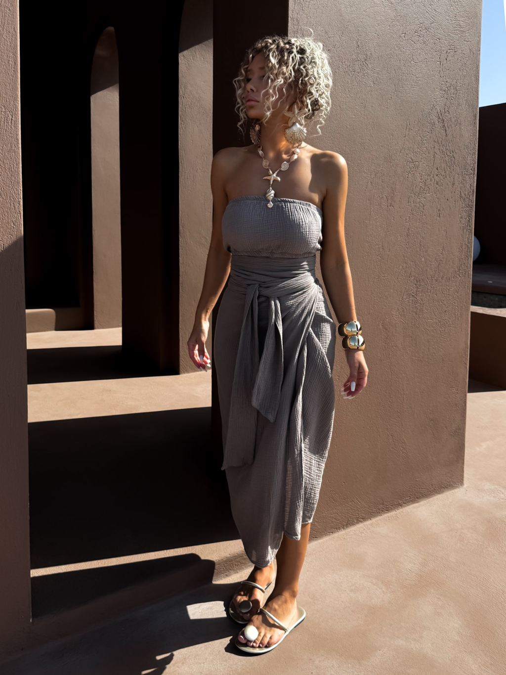 Šedohnědý mušelínový variabilní přehoz top šaty DASHER