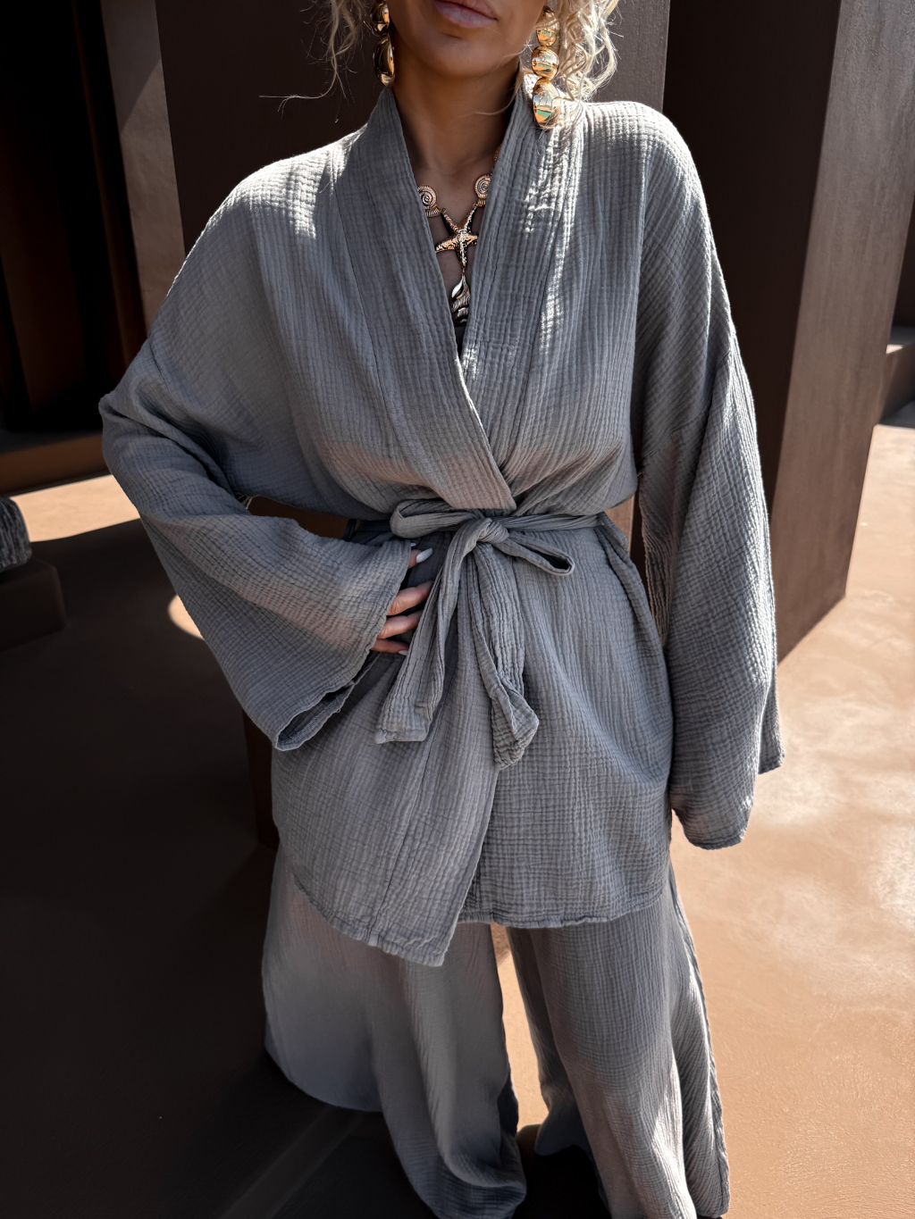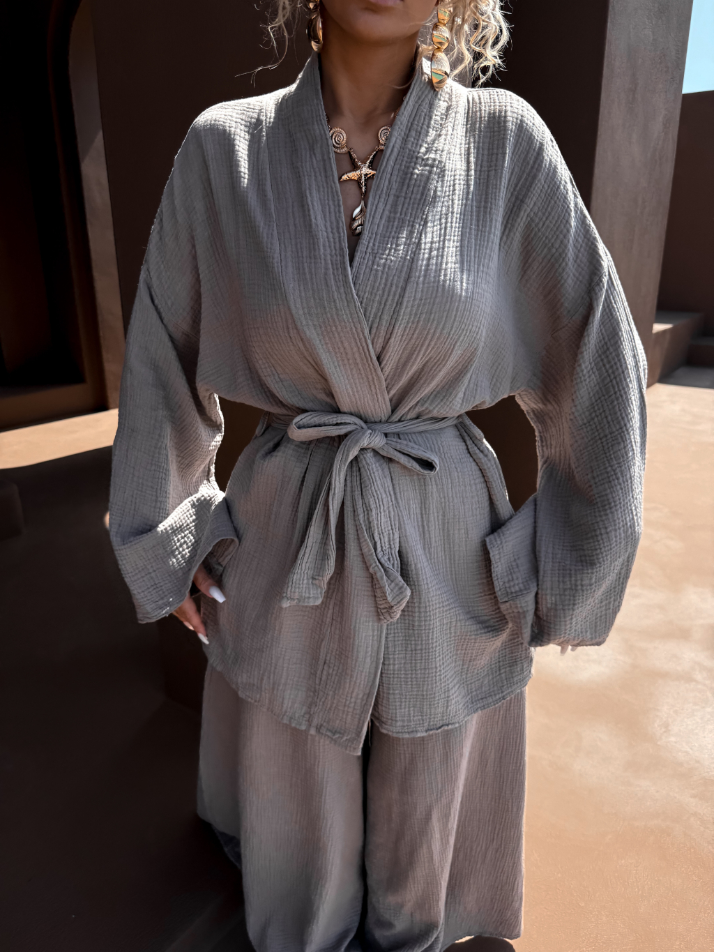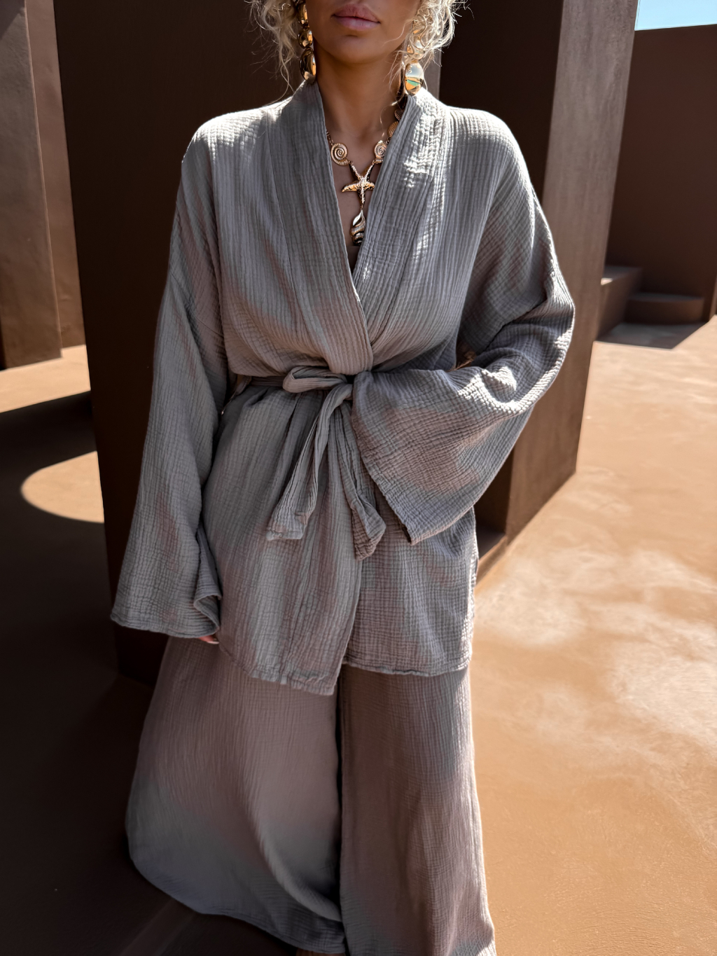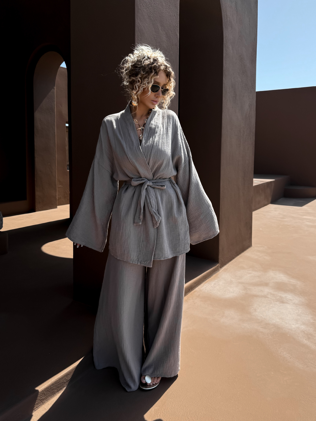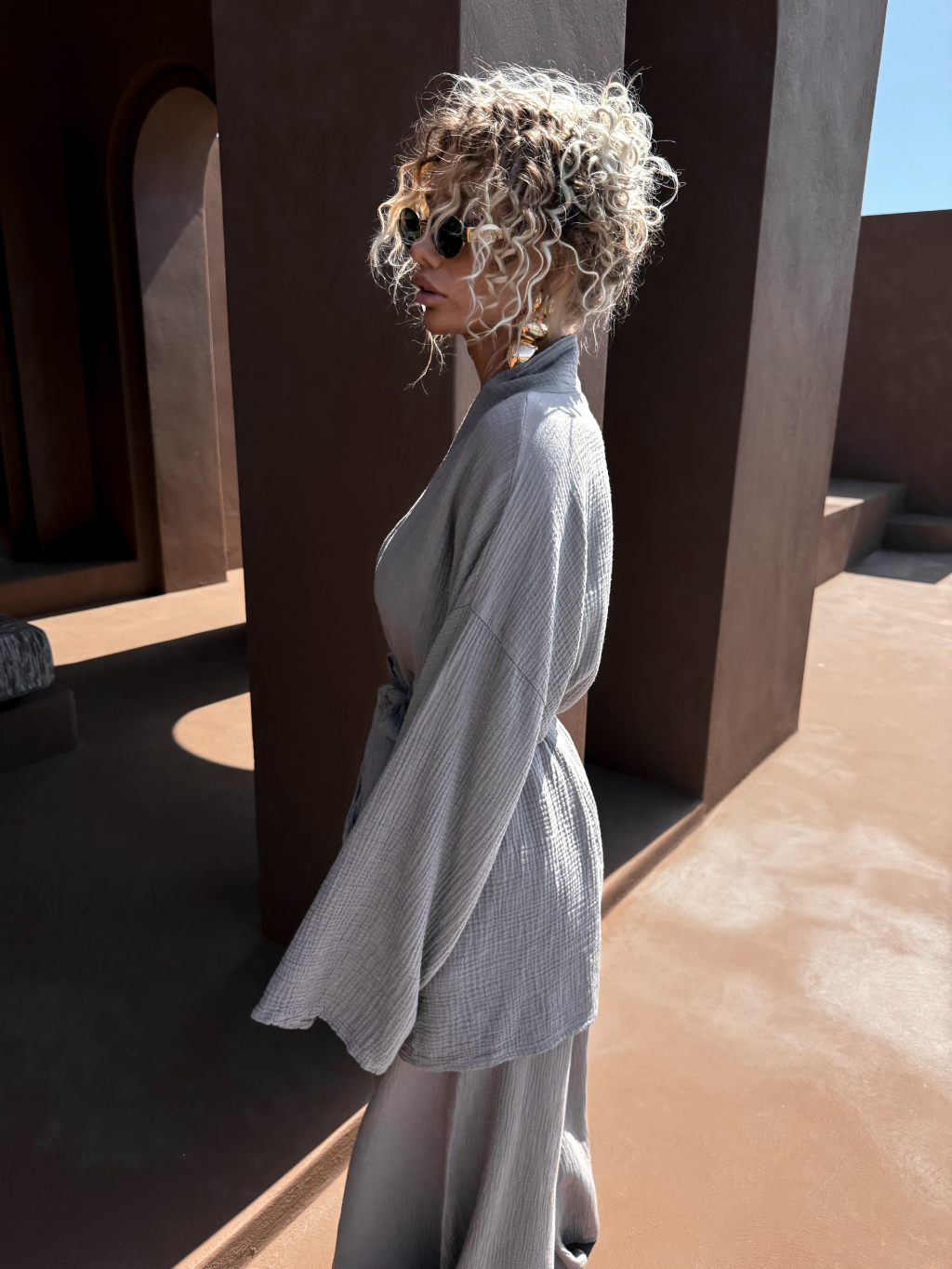 Šedohnědý mušelínový zavazovací cardigan CHANIA