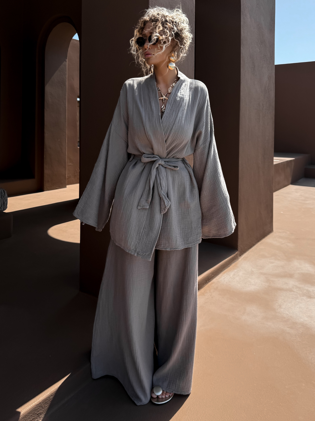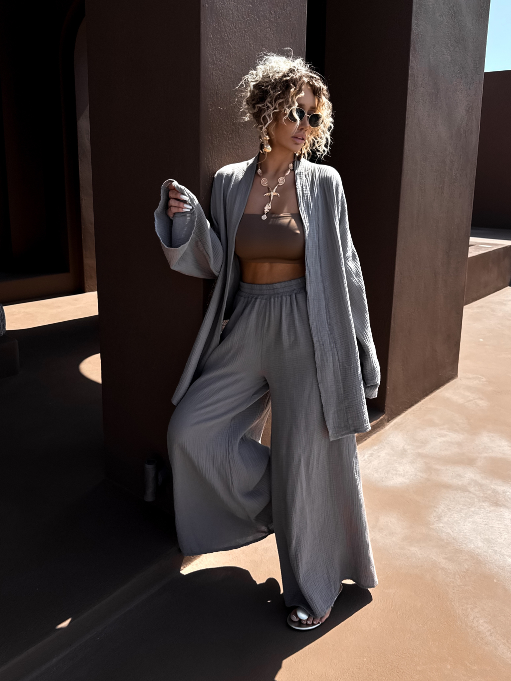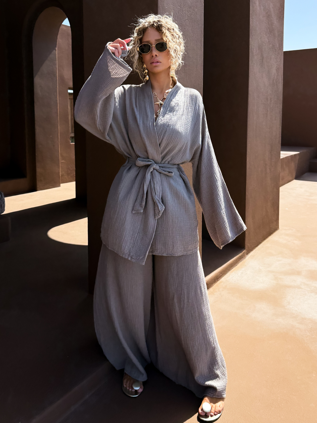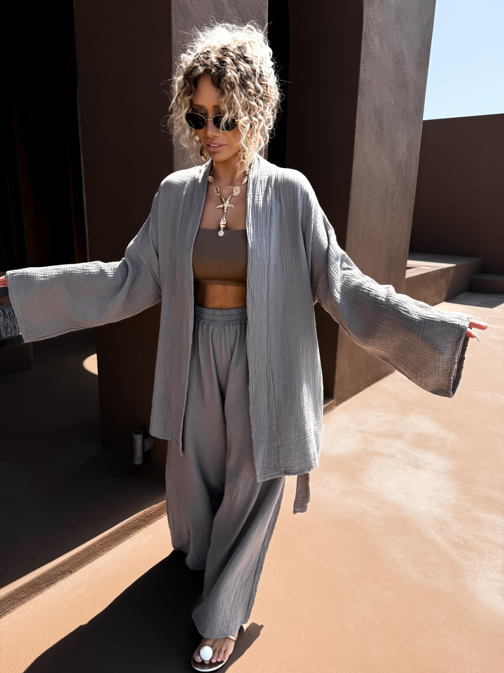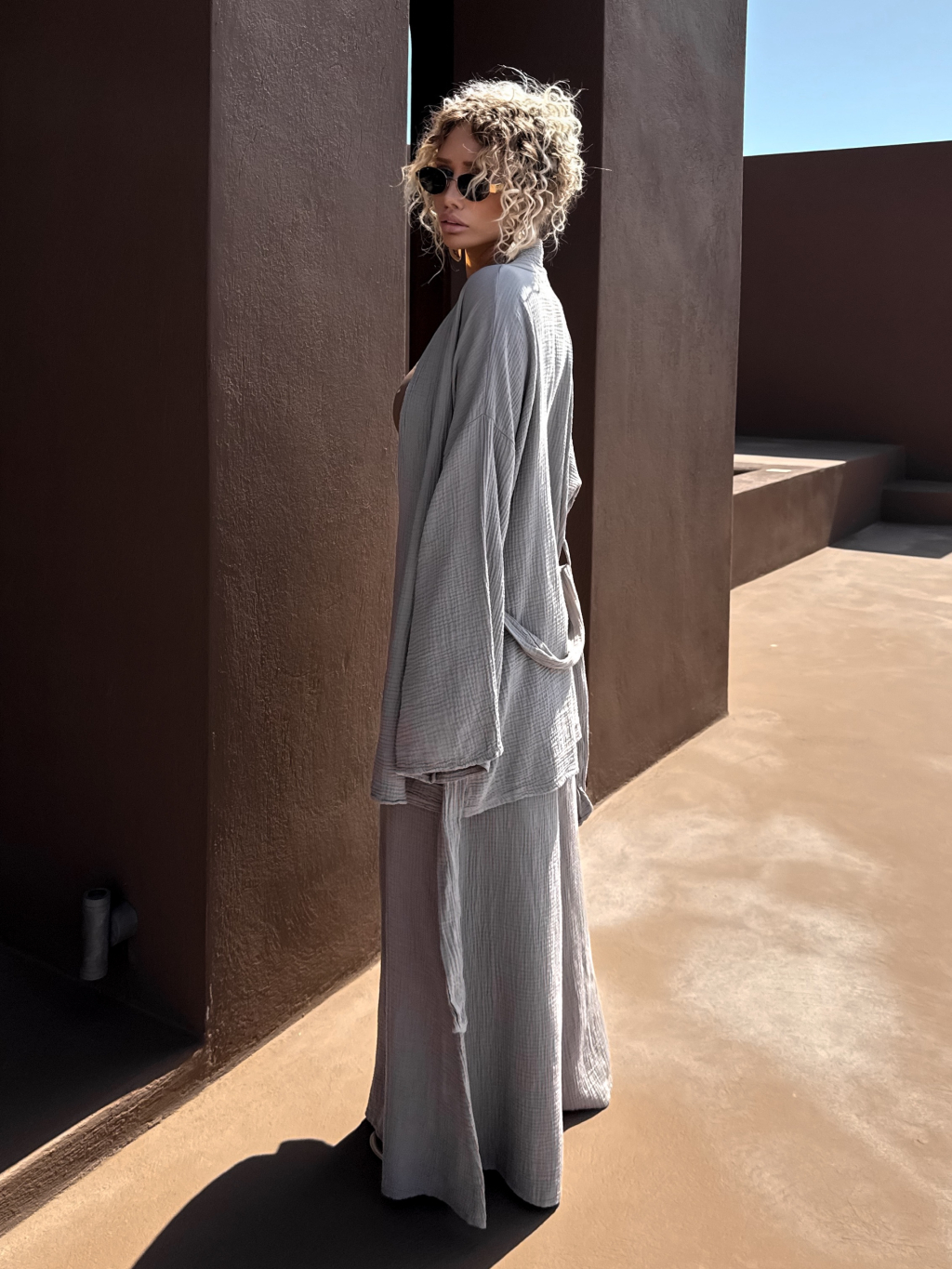 Šedohnědý mušelínový zavazovací cardigan CHANIA