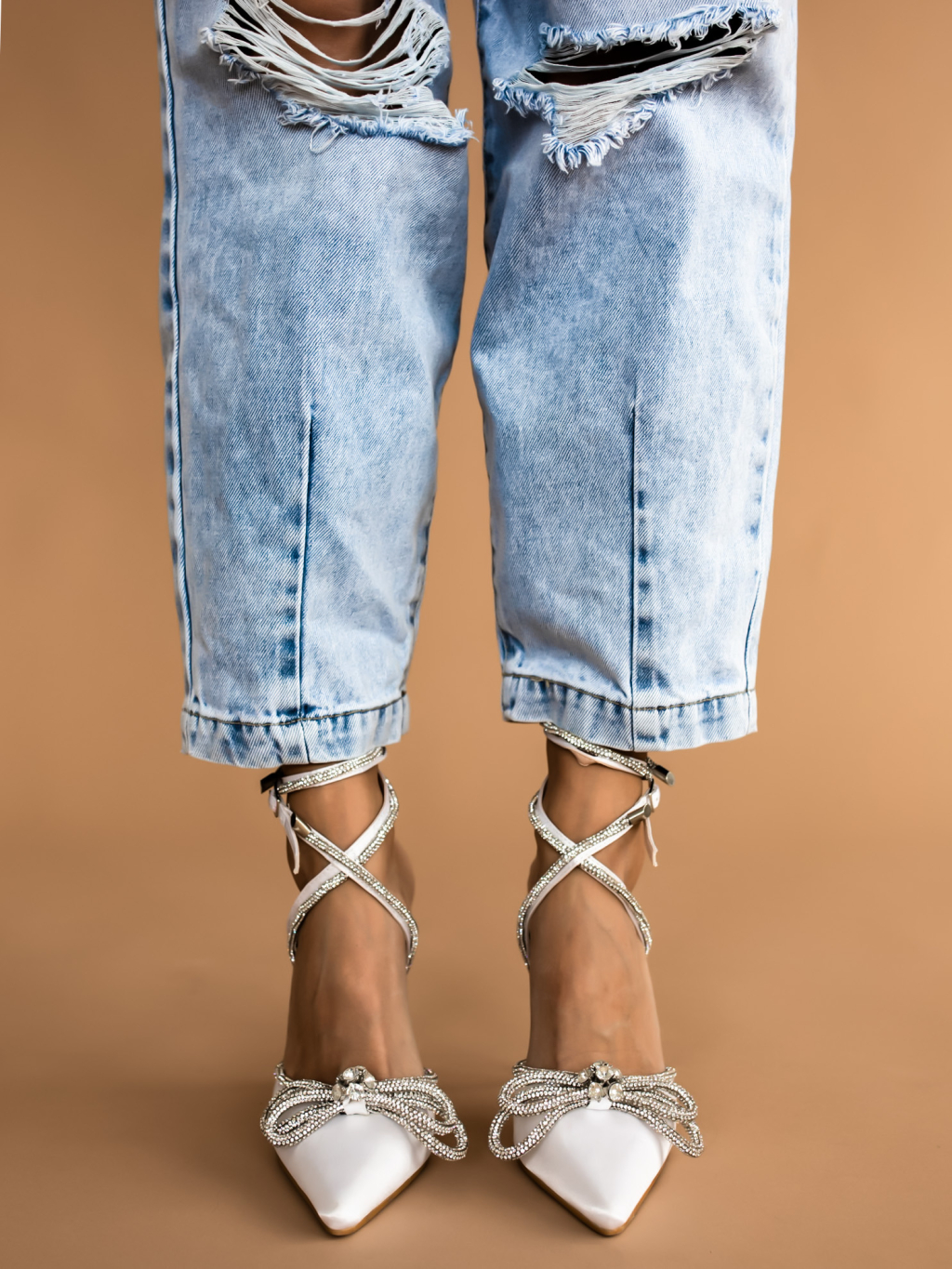 Bílé boty na podpatku DEFENSE se stříbrným zdobením