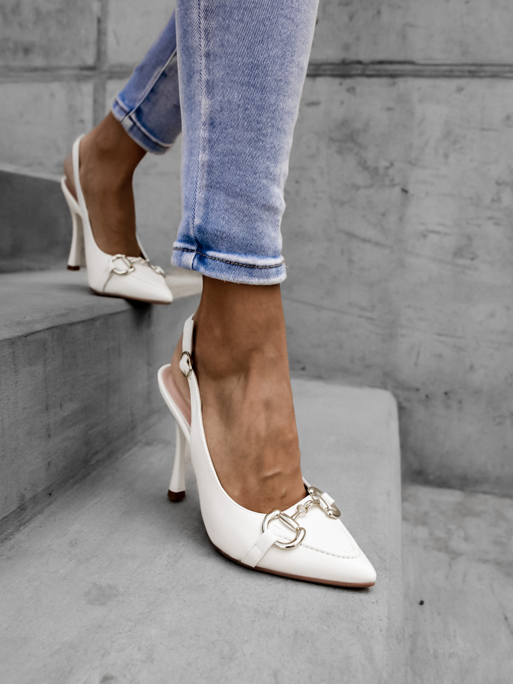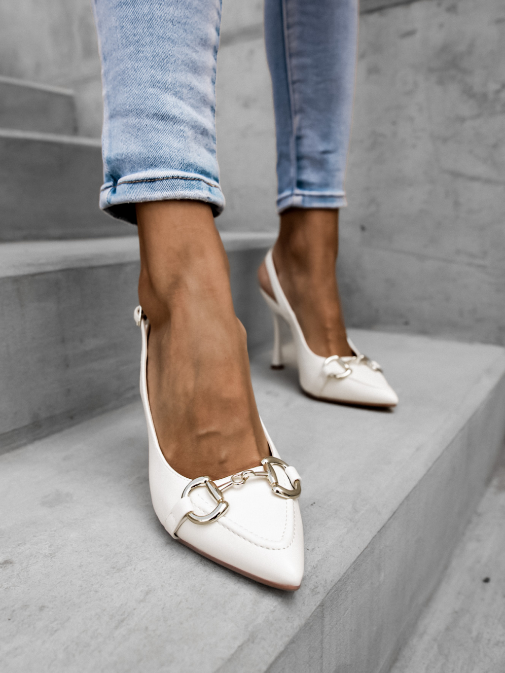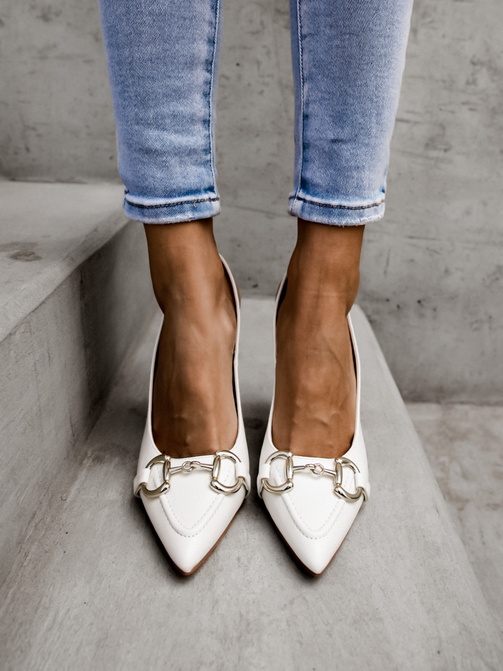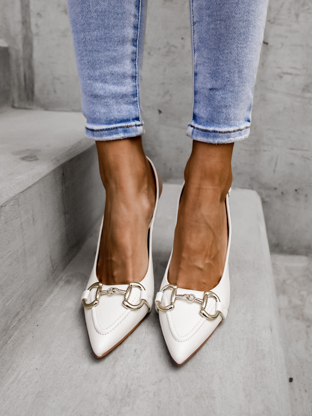 Bílé boty na podpatku MYSTIE se zlatou sponou