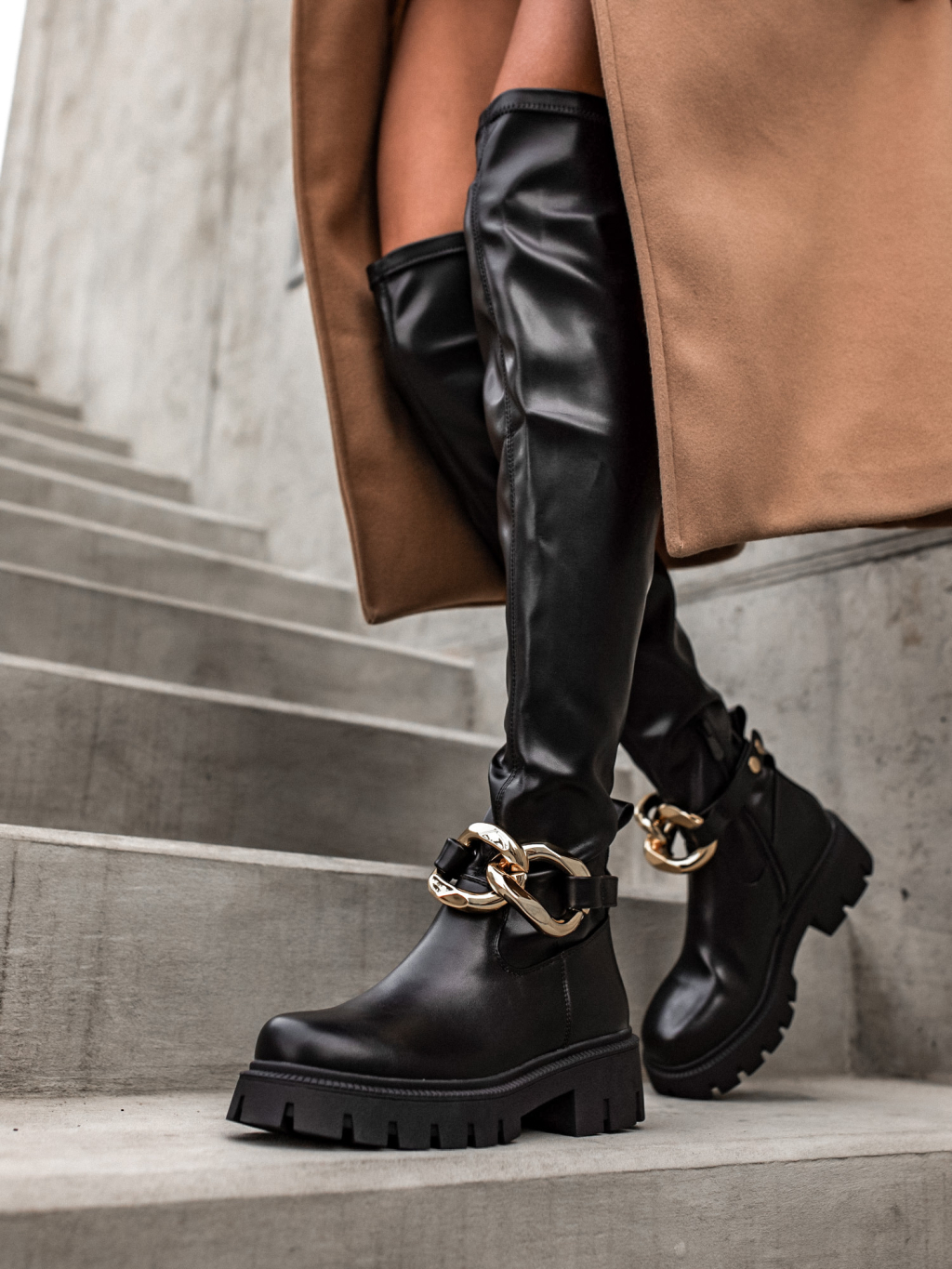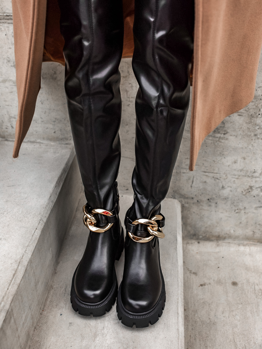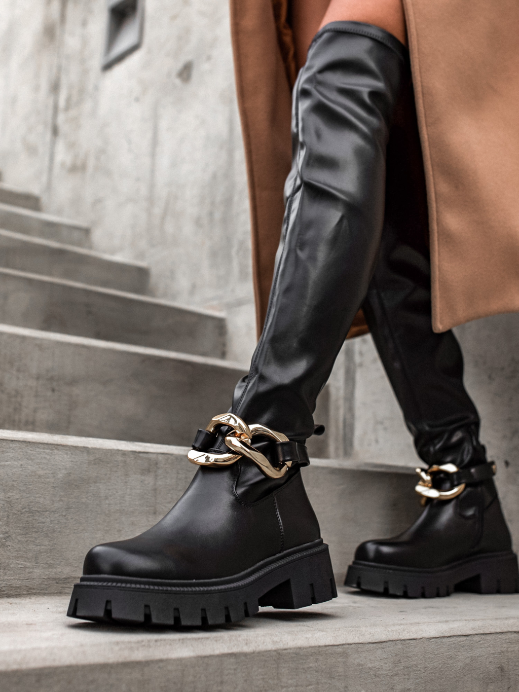 Černé koženkové kozačky LUIZA se zlatým zdobením