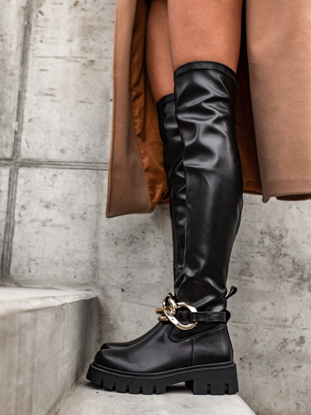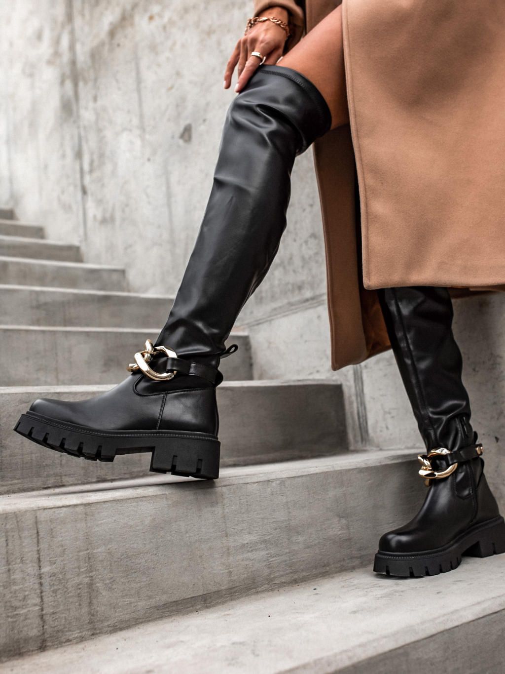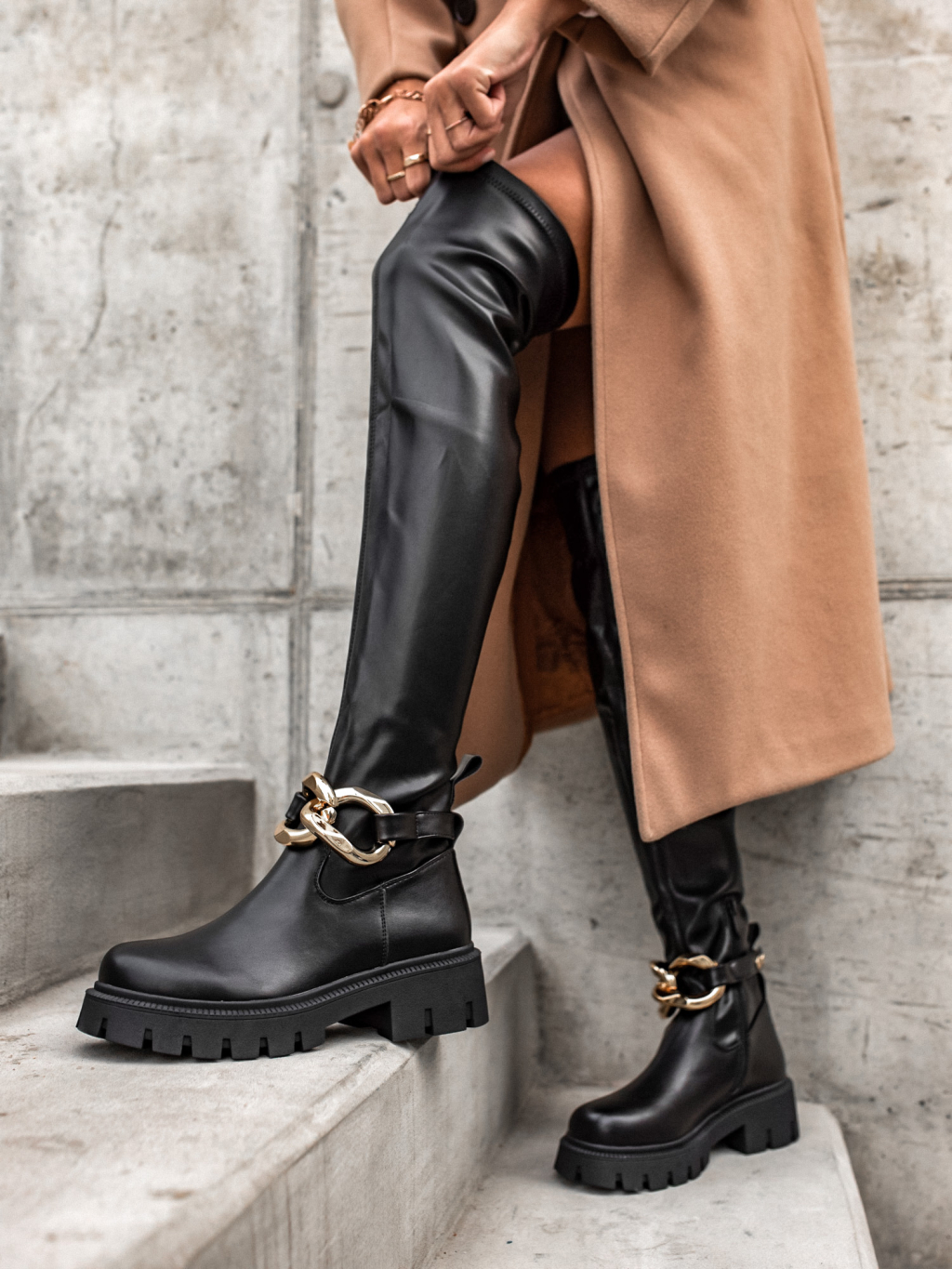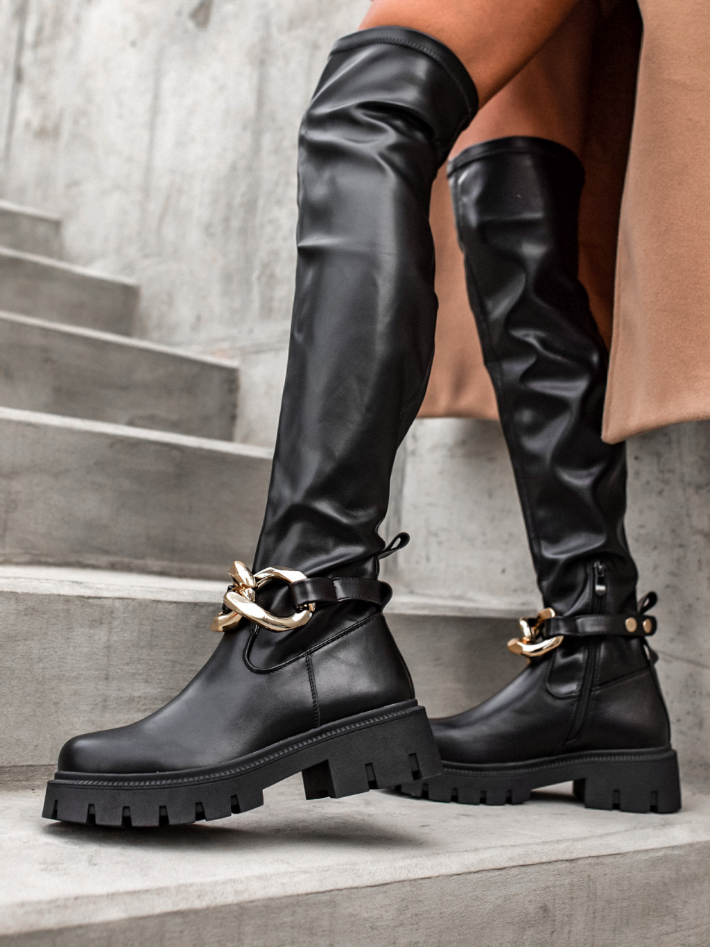 Černé koženkové kozačky LUIZA se zlatým zdobením