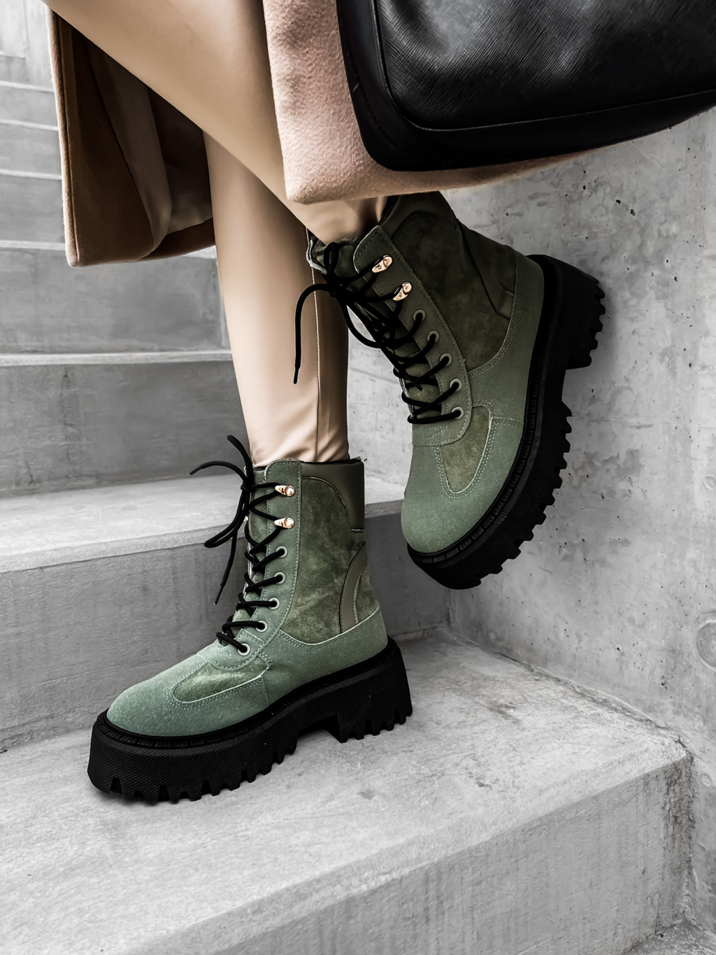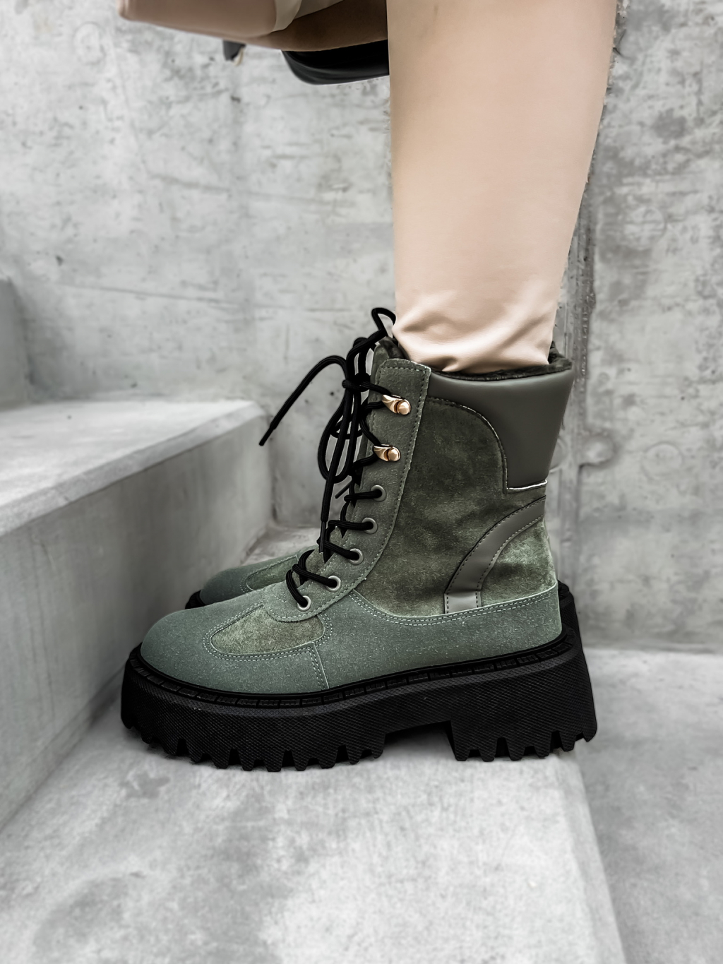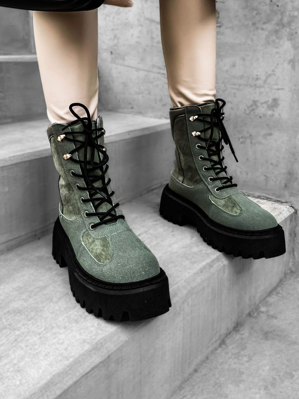 Khaki semišové kotníkové boty GROVEY s vysokou podrážkou