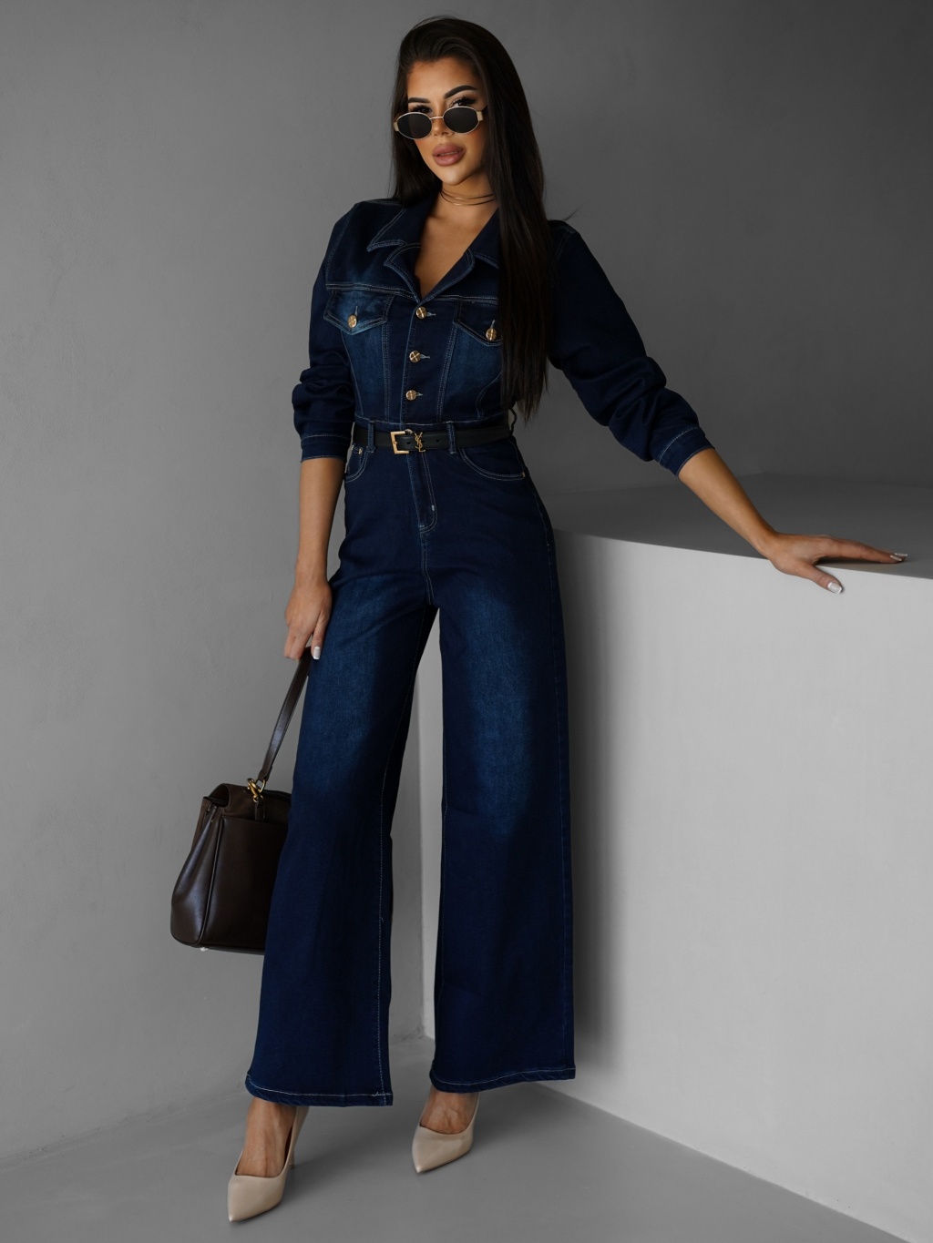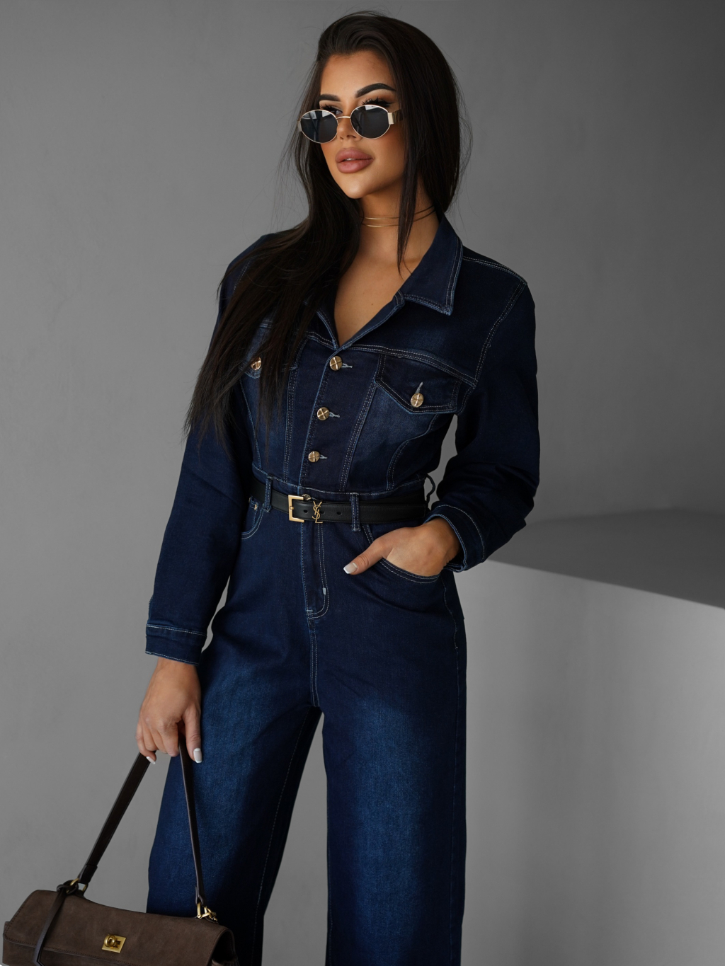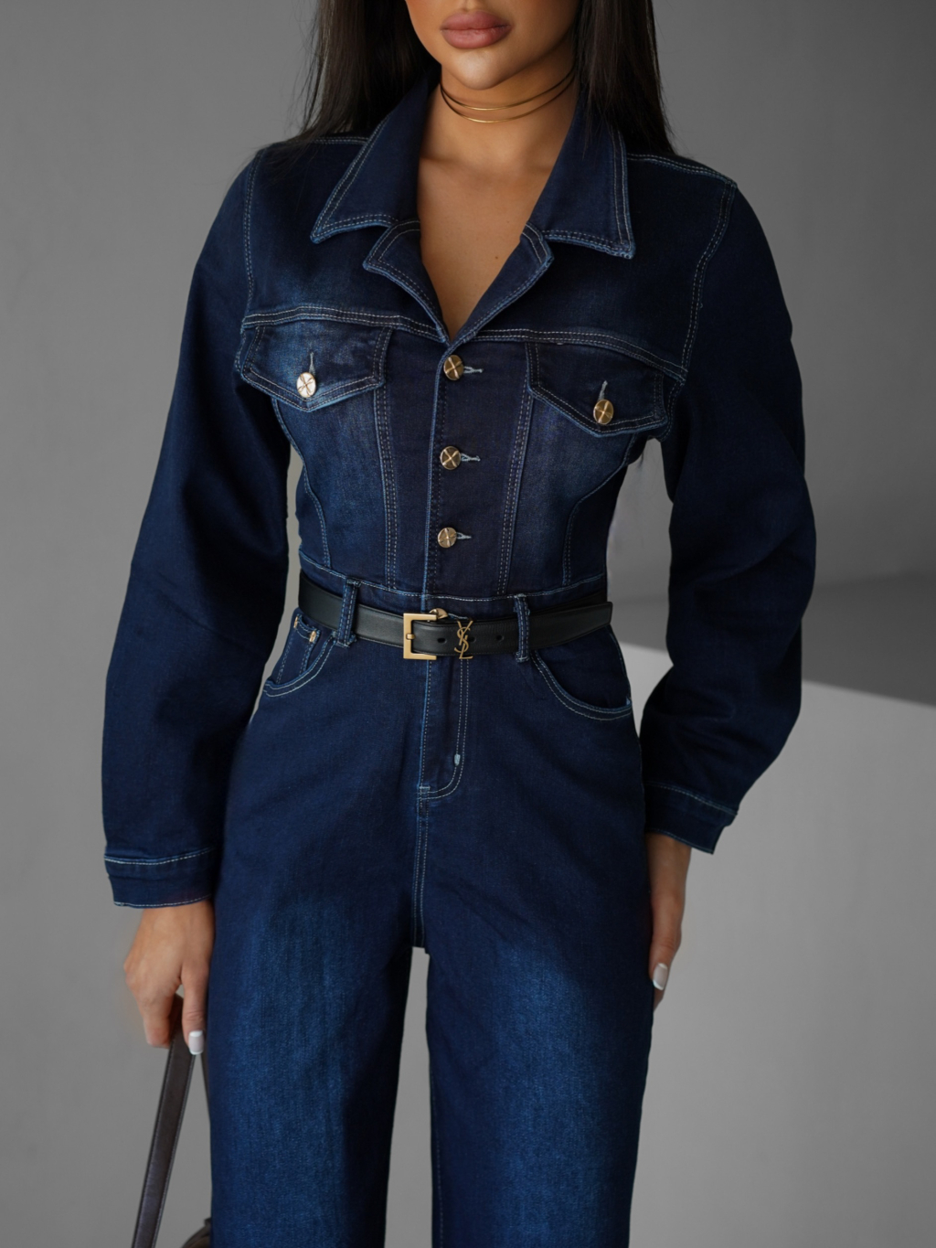 Tmavě modrý džínový dlouhý overal SOUAN s dlouhým rukávem