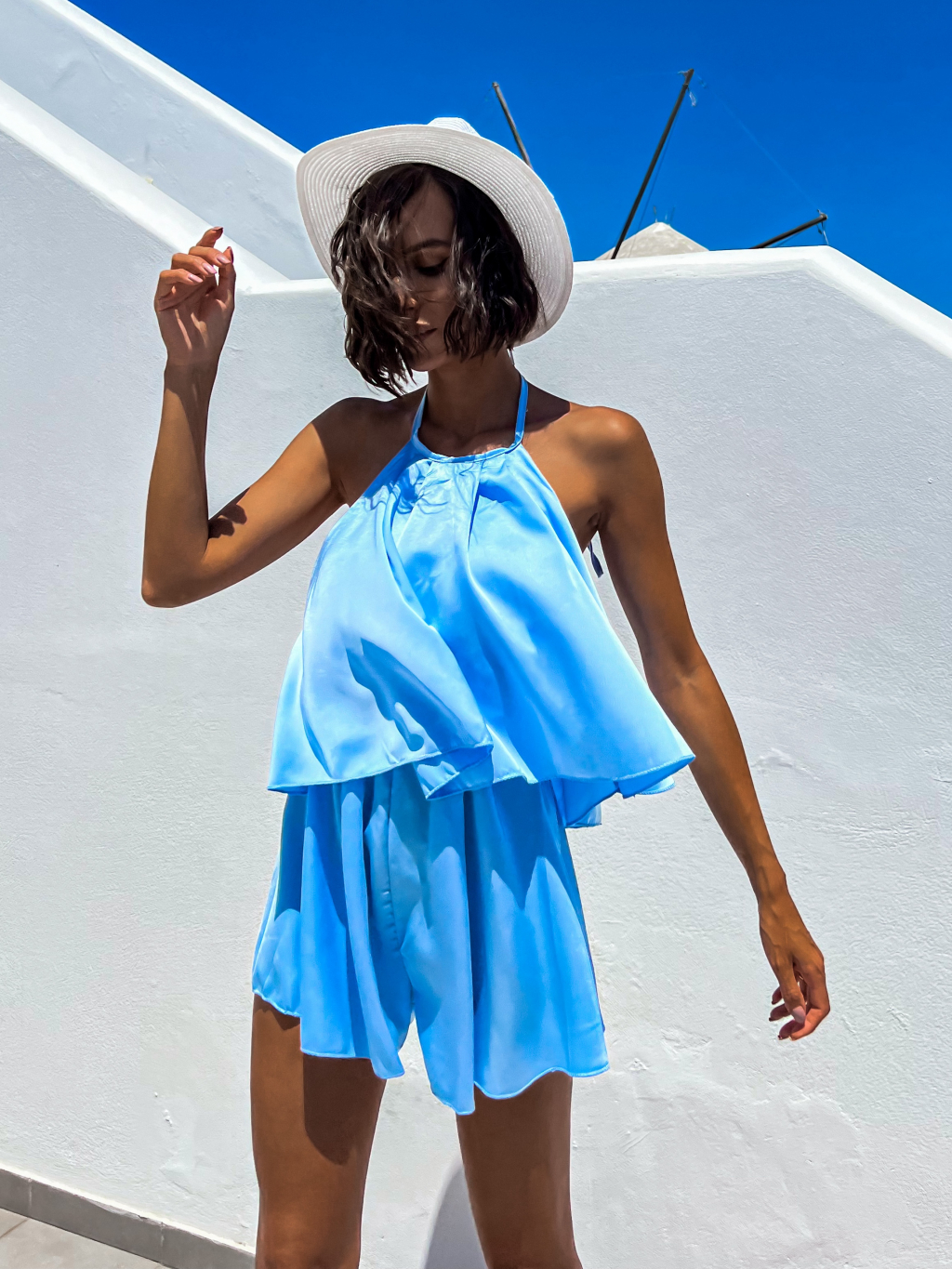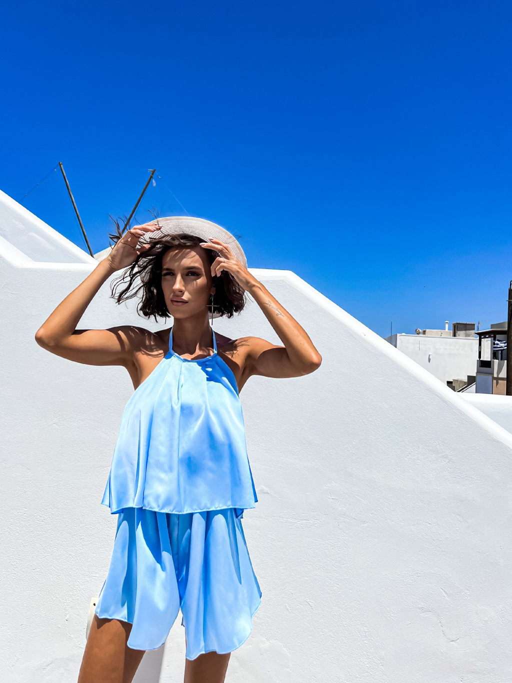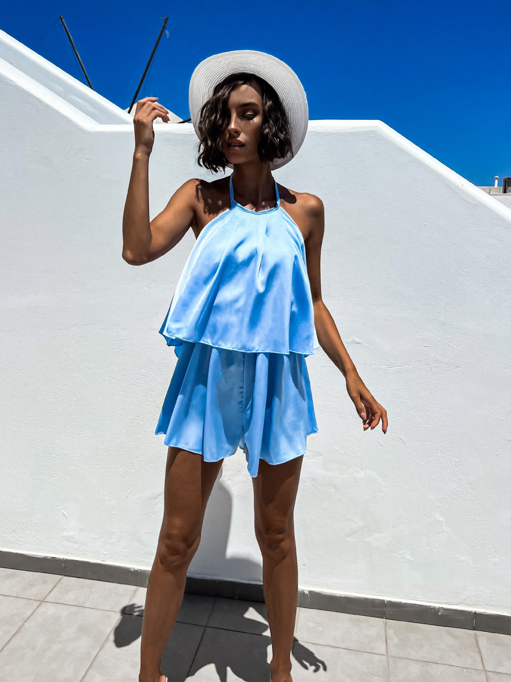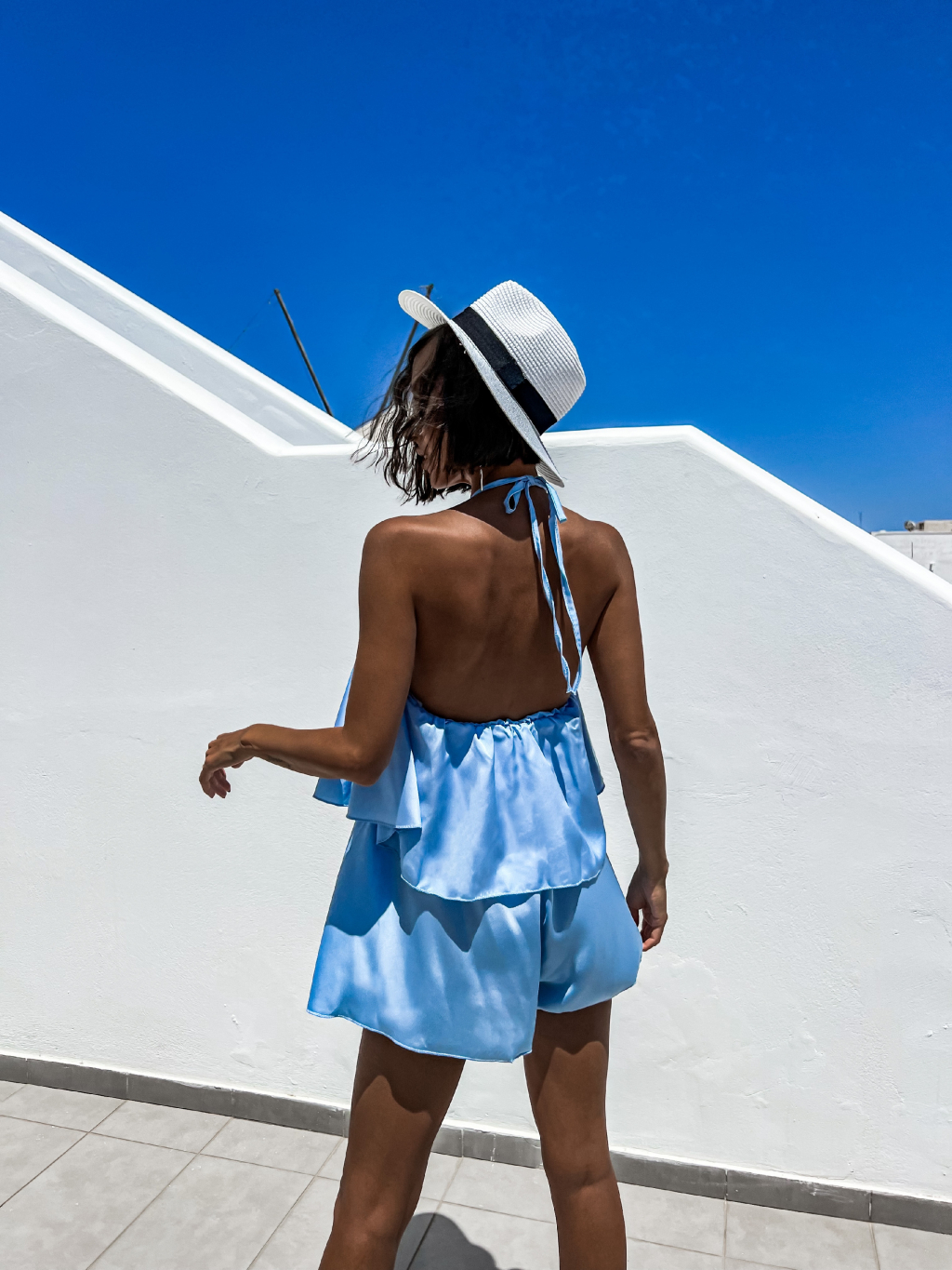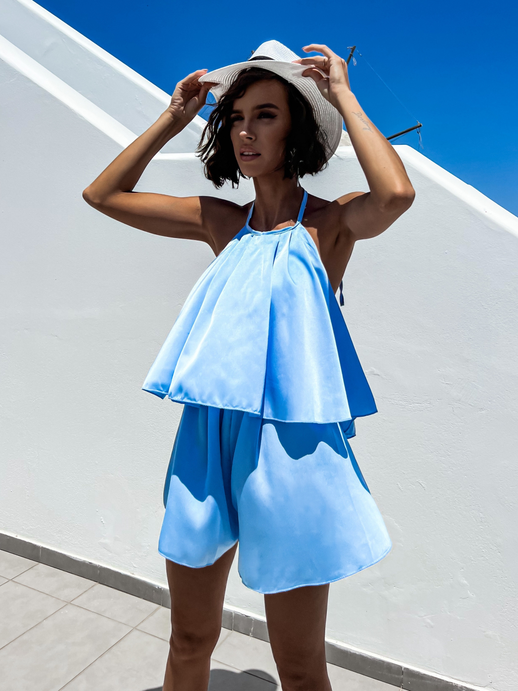 Světle modrý volánkový overal RHODYE se zavazováním za krk