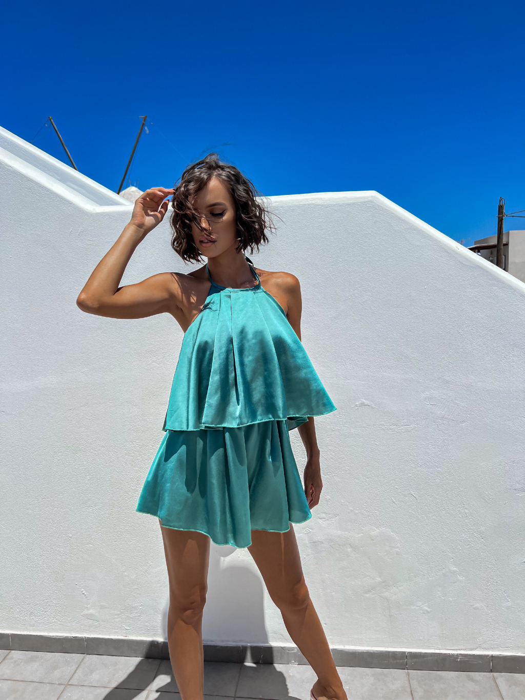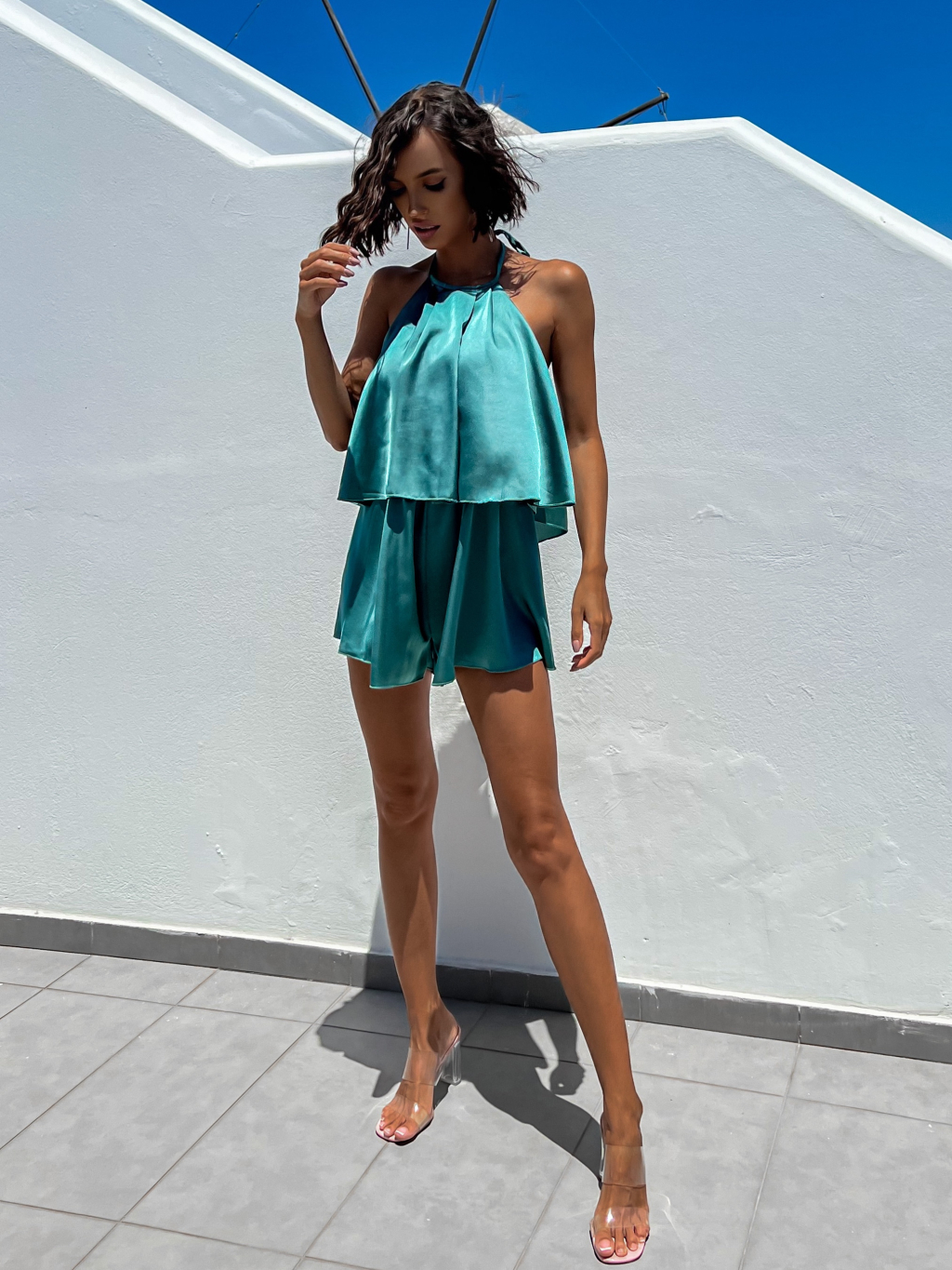 Tyrkysový volánkový overal RHODYE se zavazováním za krk