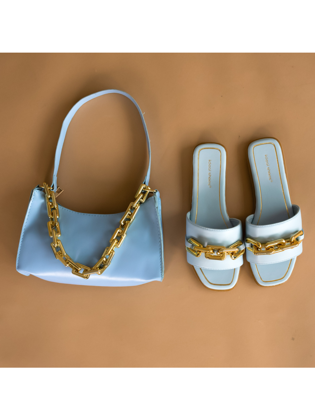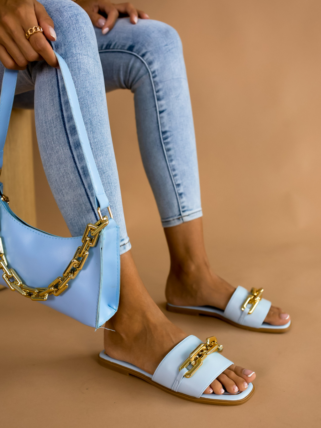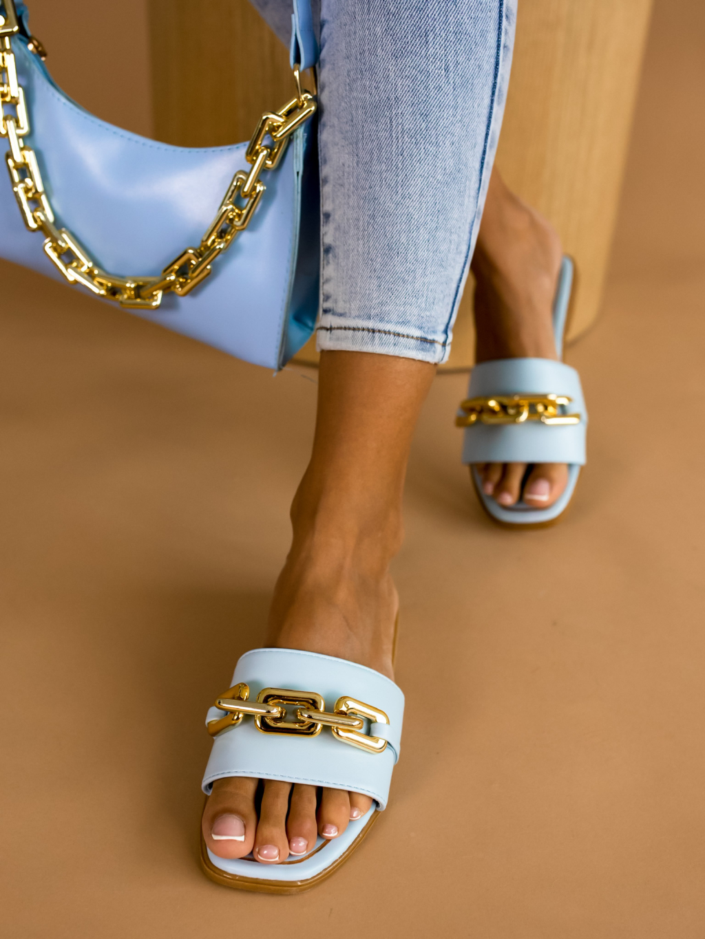 Světle modré pantofle MORTY se zlatým řetízkem