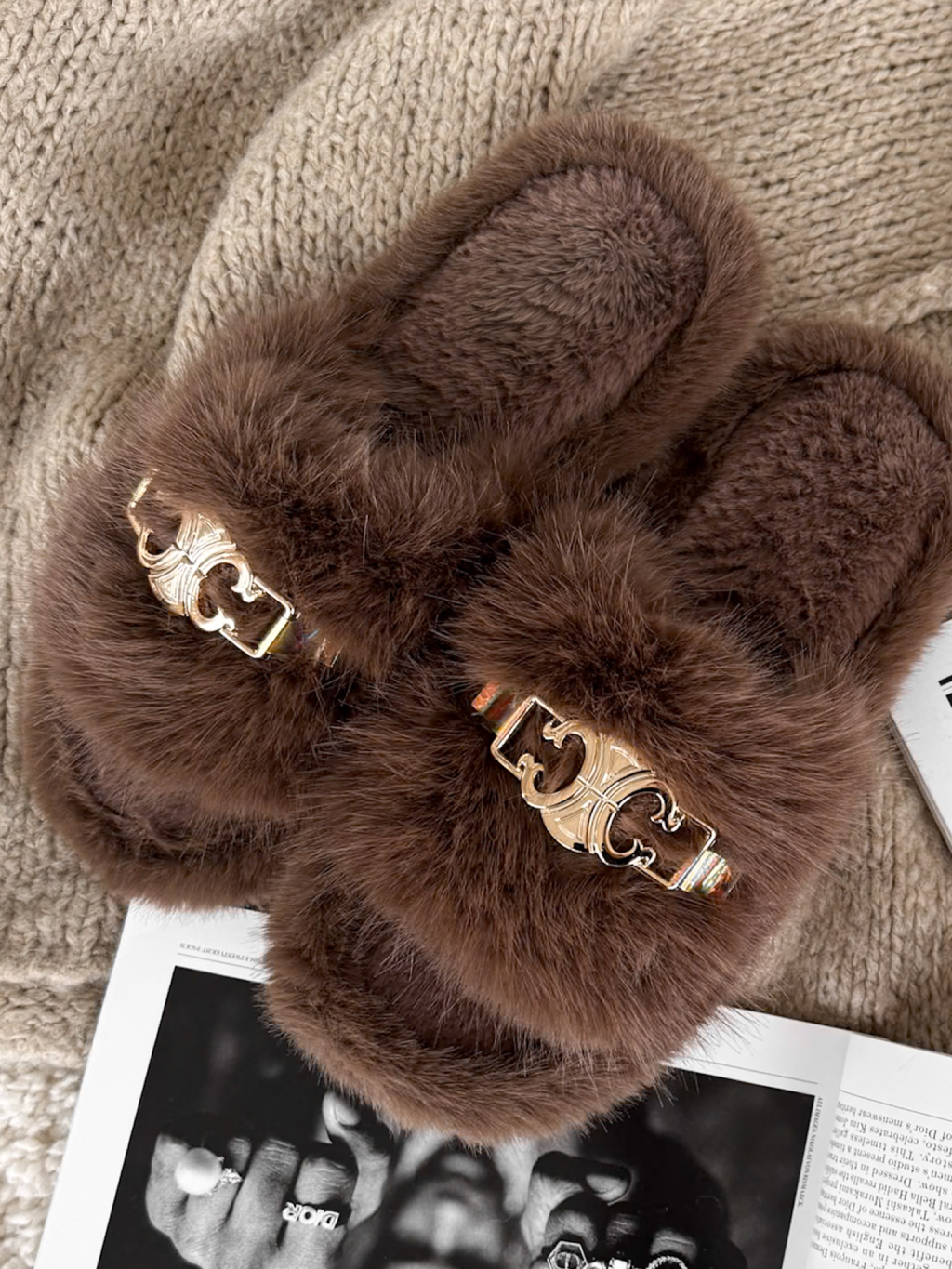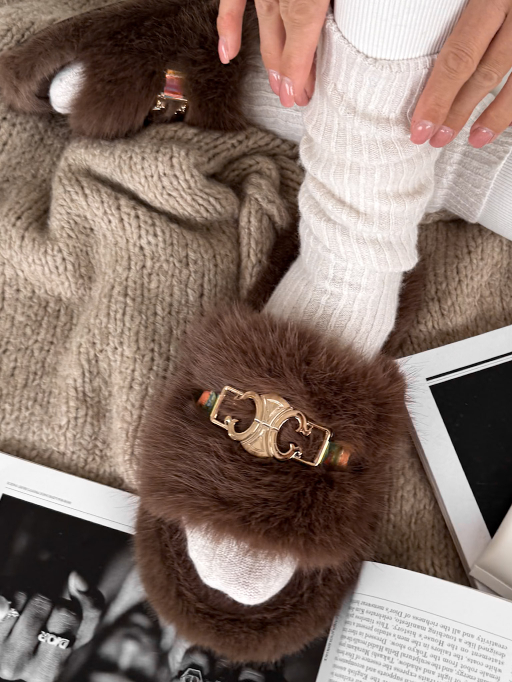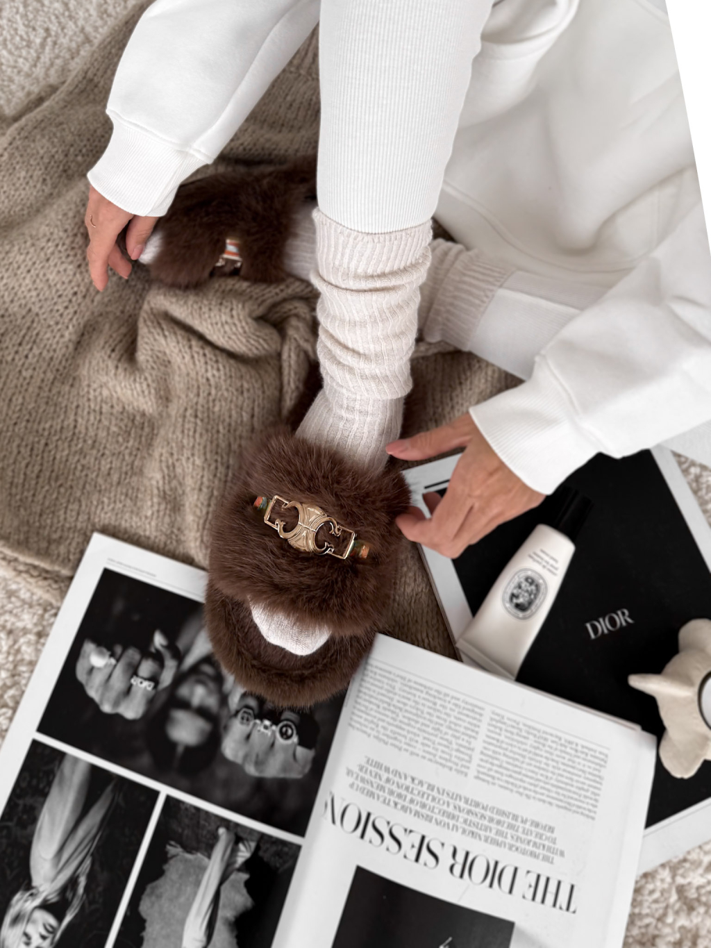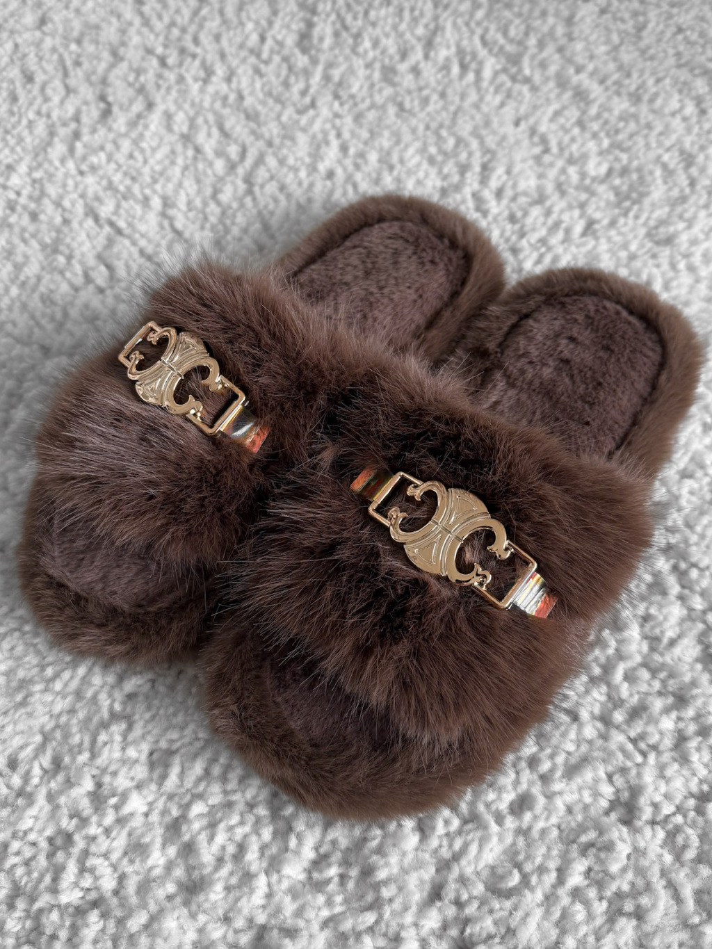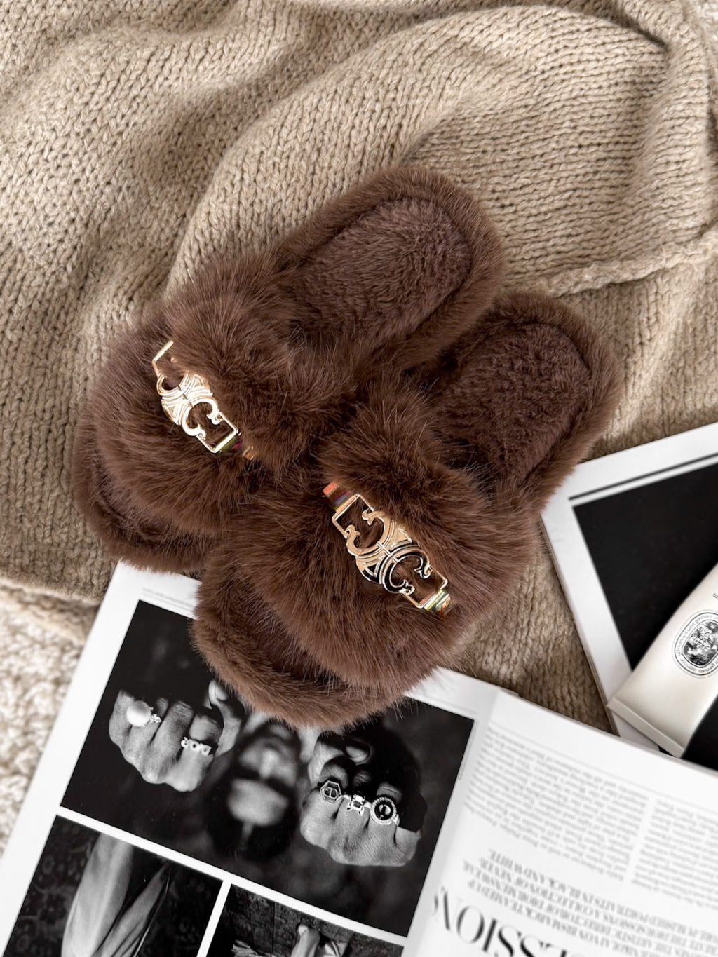 Tmavě hnědé domácí huňaté pantofle SOFTIES s ozdobou