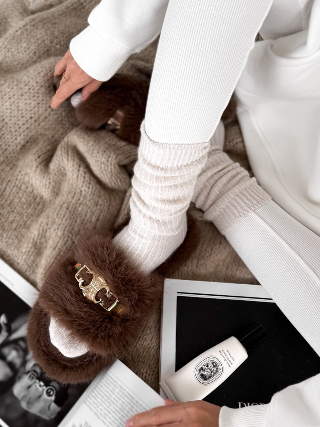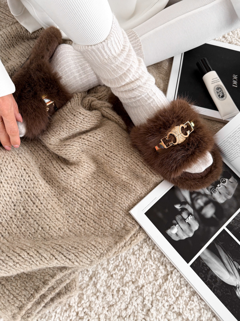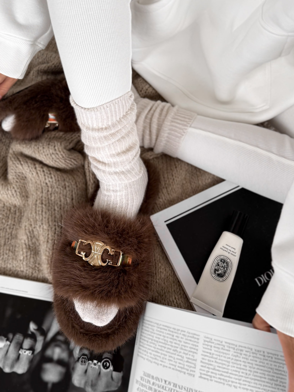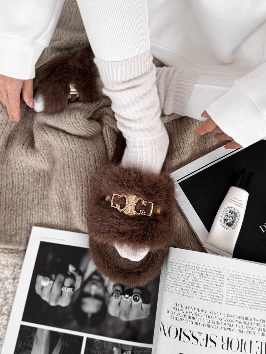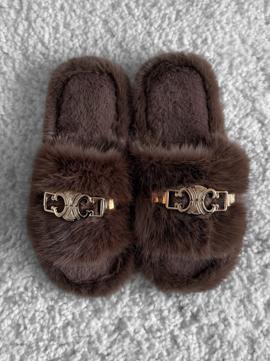 Tmavě hnědé domácí huňaté pantofle SOFTIES s ozdobou