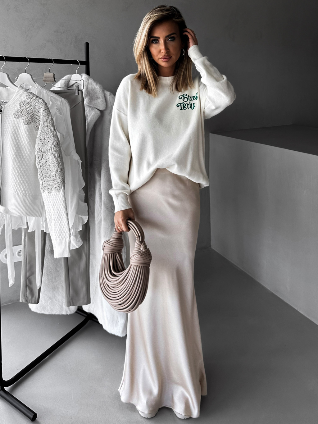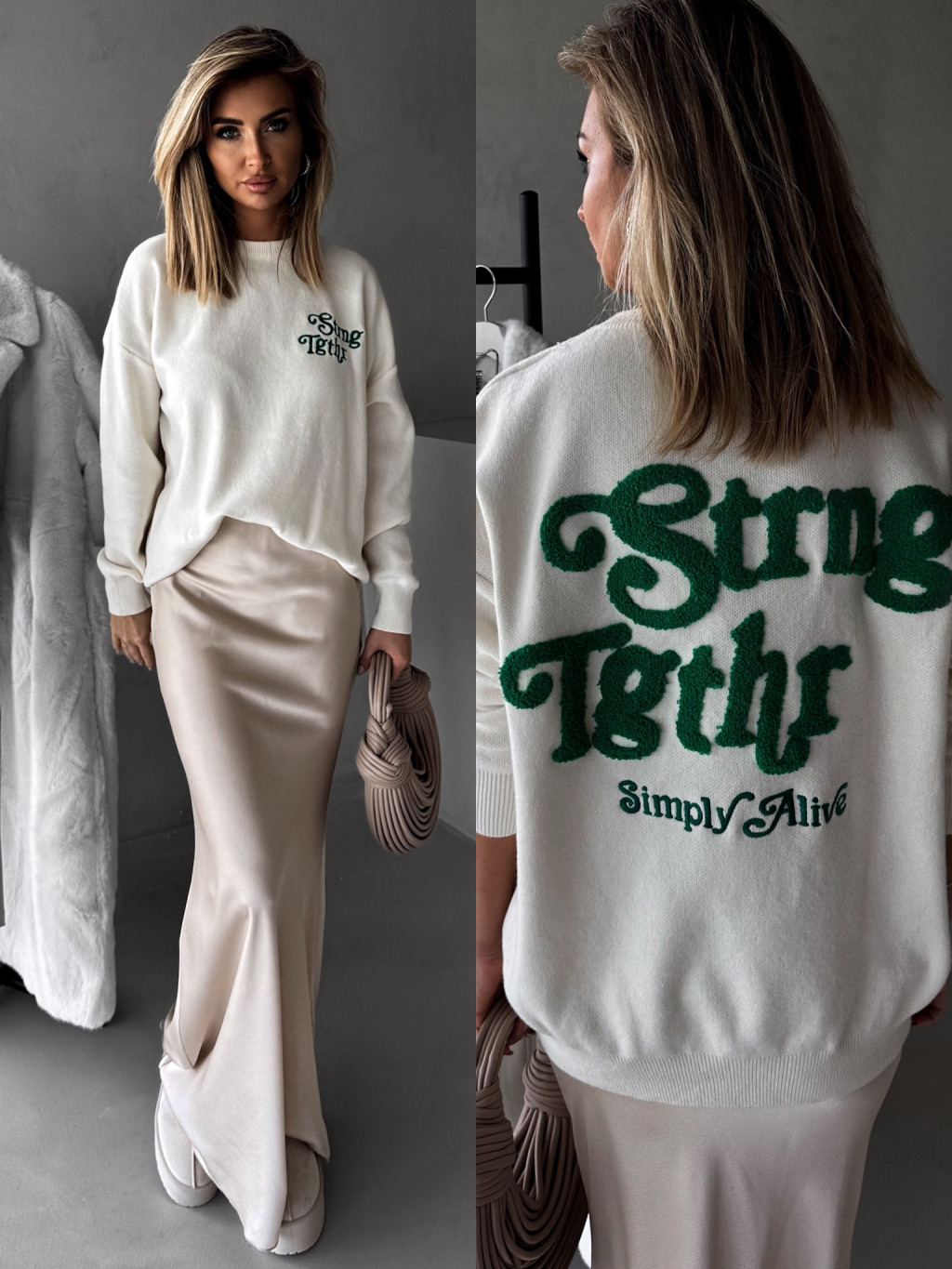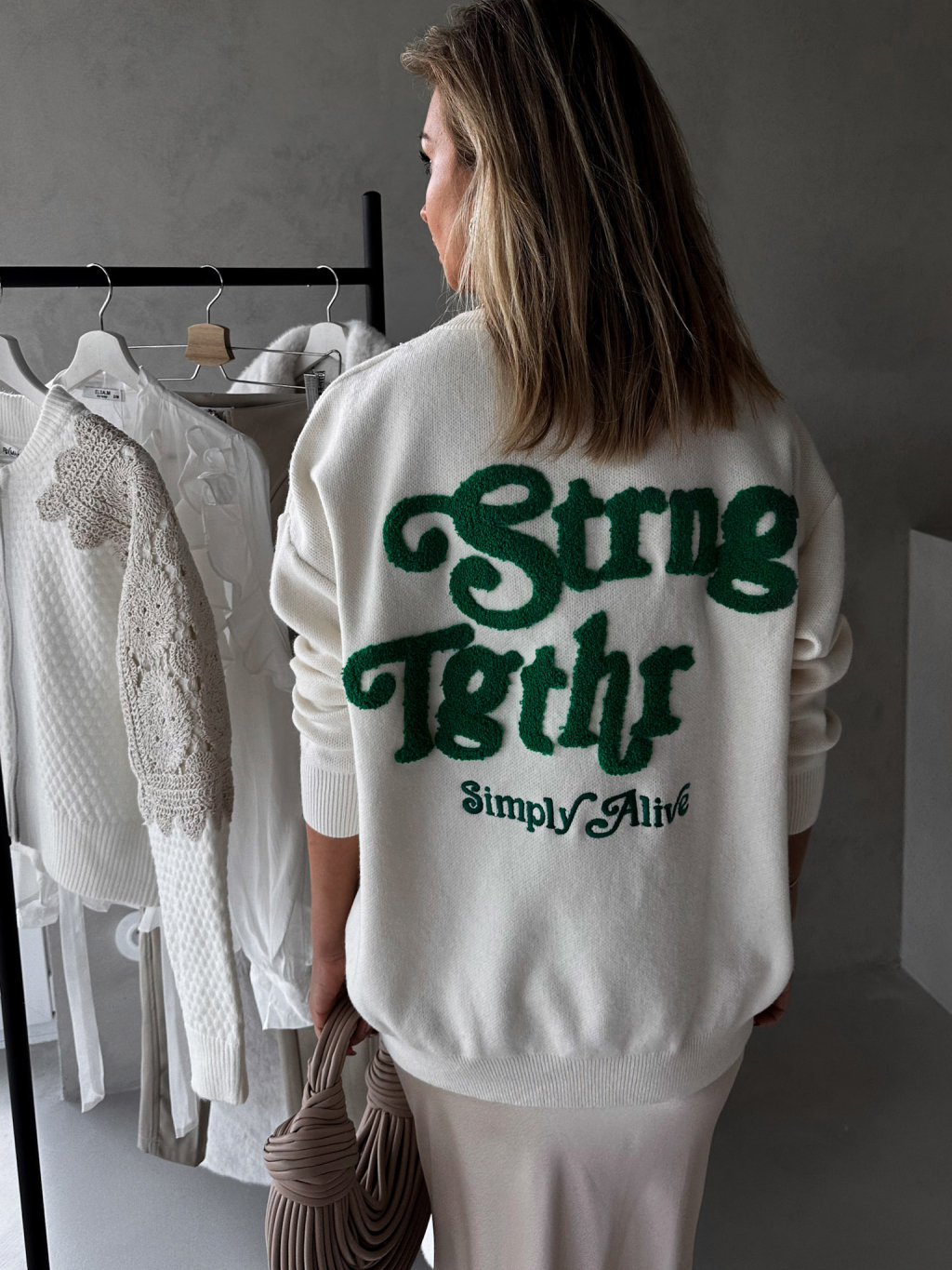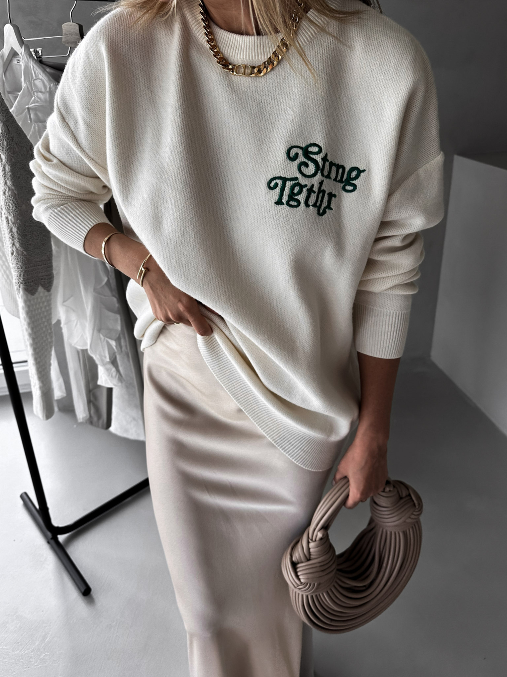 Krémový svetr MARIE se zelenou výšivkou