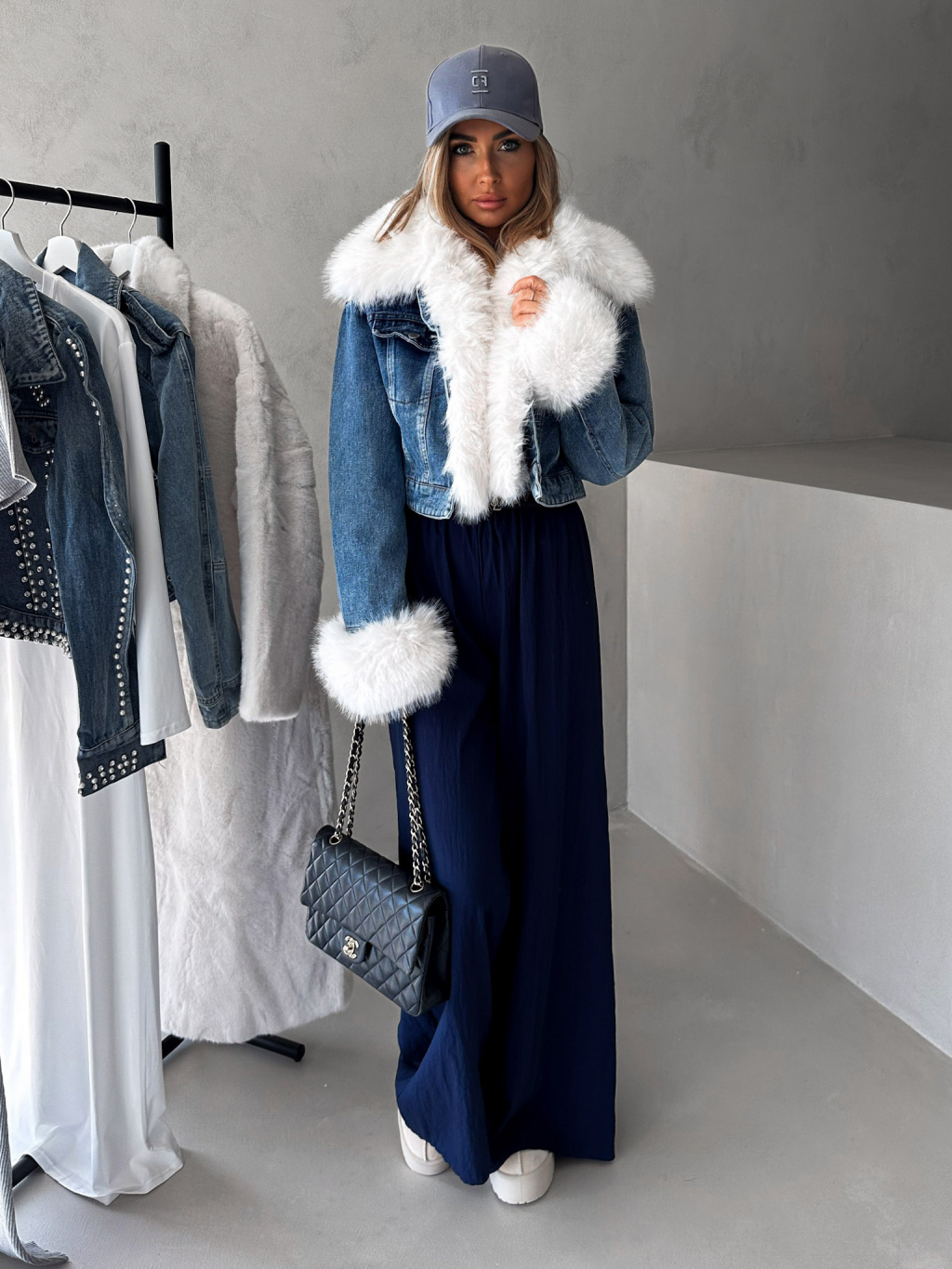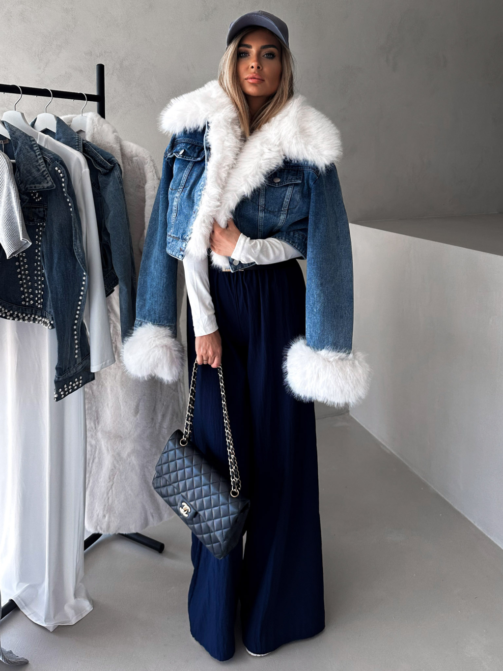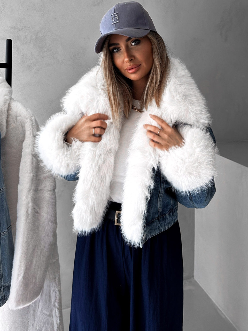 Modrá krátká džínová bunda NITSA s bílým kožíškem
