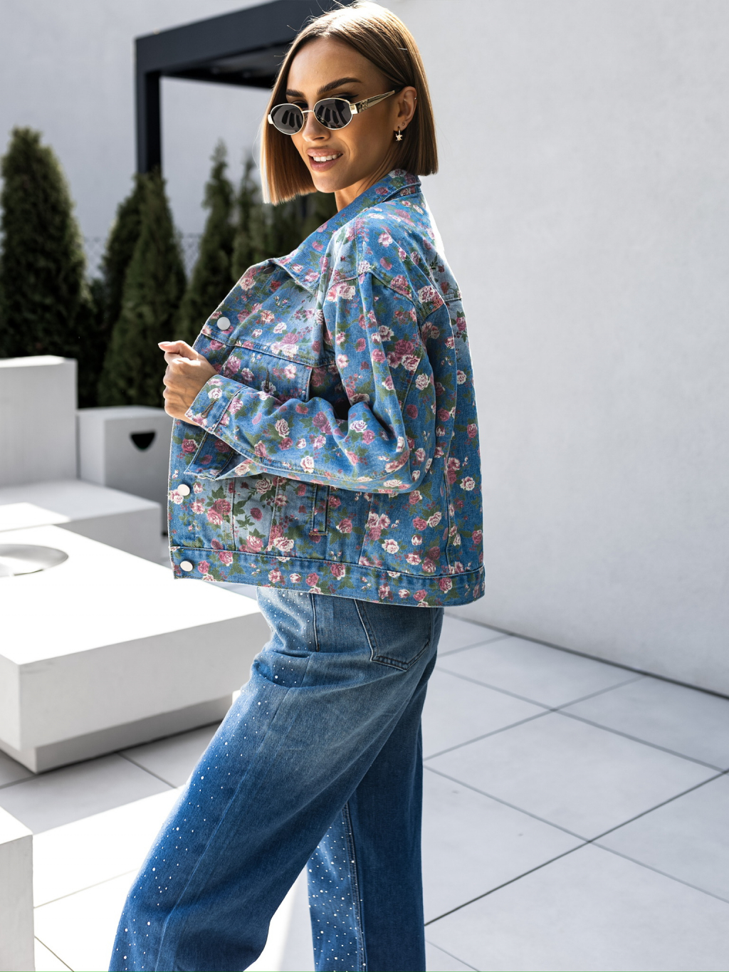 Modrá květovaná džínová bunda OGNJAJ s kytičkami