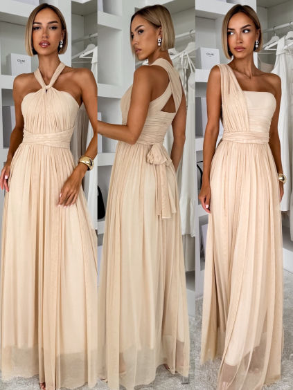 Béžové lesklé šaty VALERDI s variabilním vázáním a rozparkem