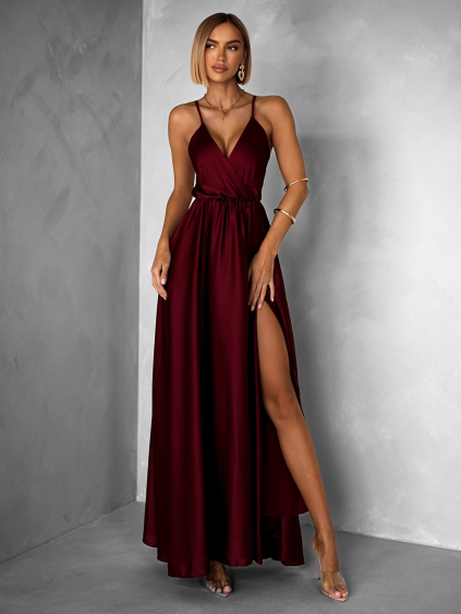 Bordó saténové šaty VALERDI s variabilním vázáním a rozparkem