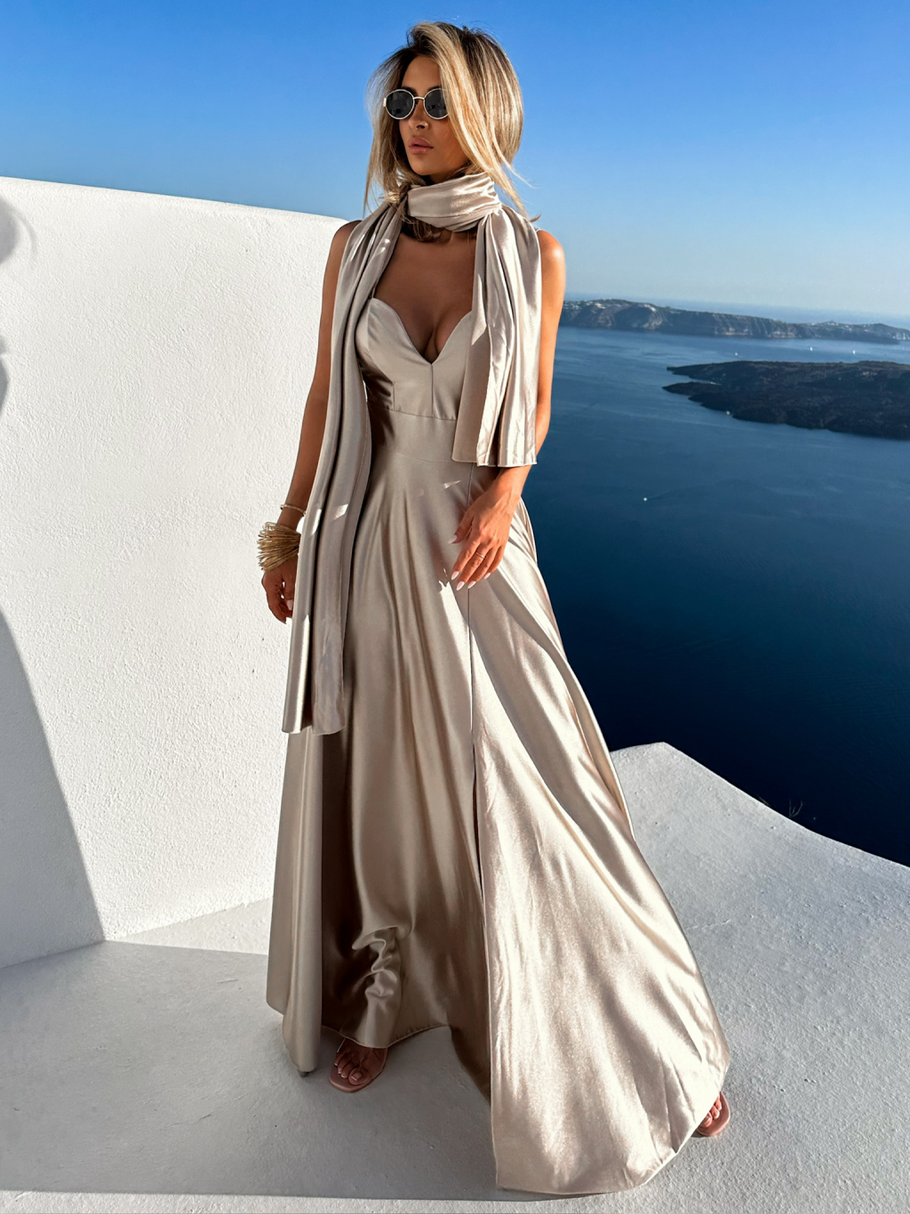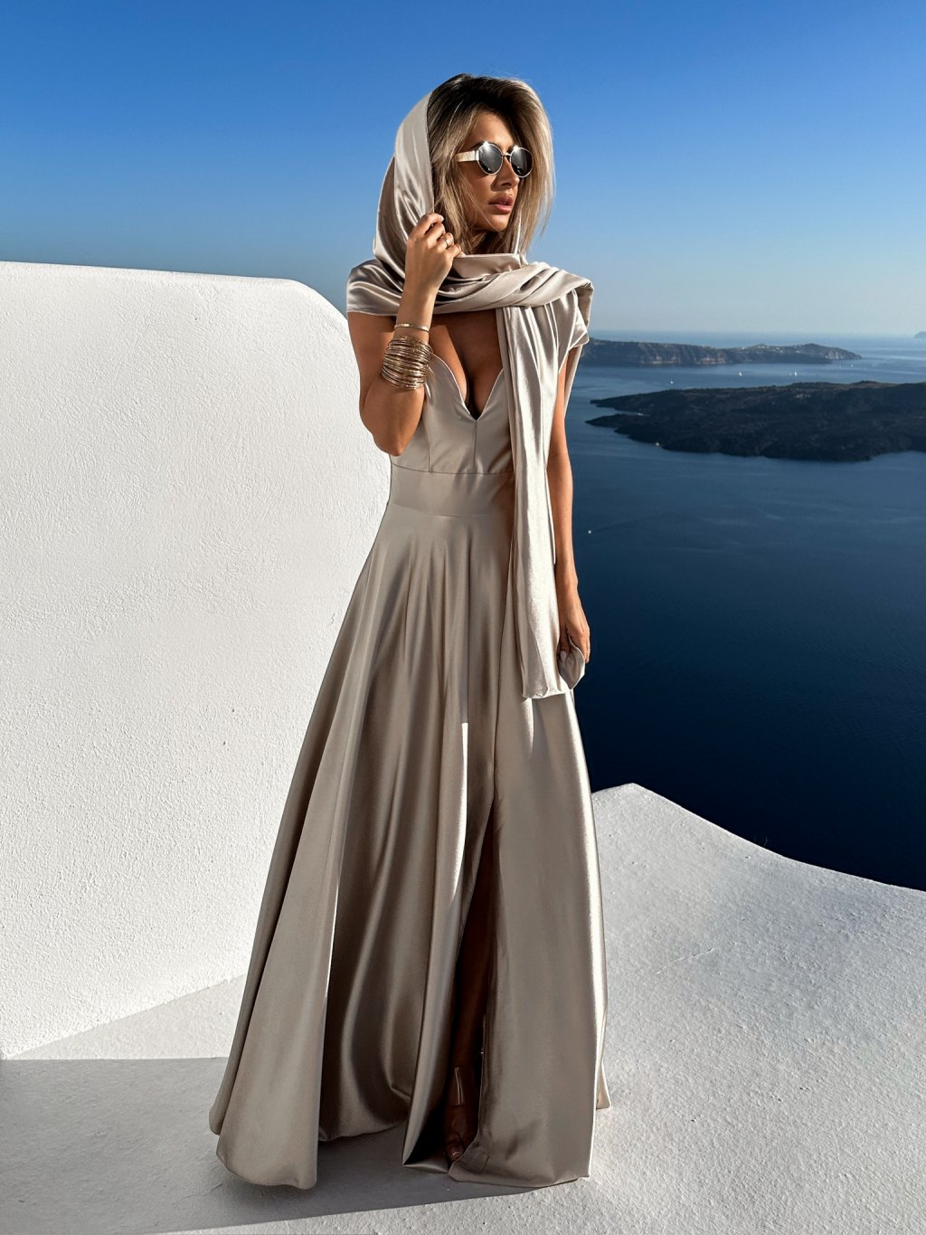 Béžové dlouhé saténové šaty KRISTAL s přehozem