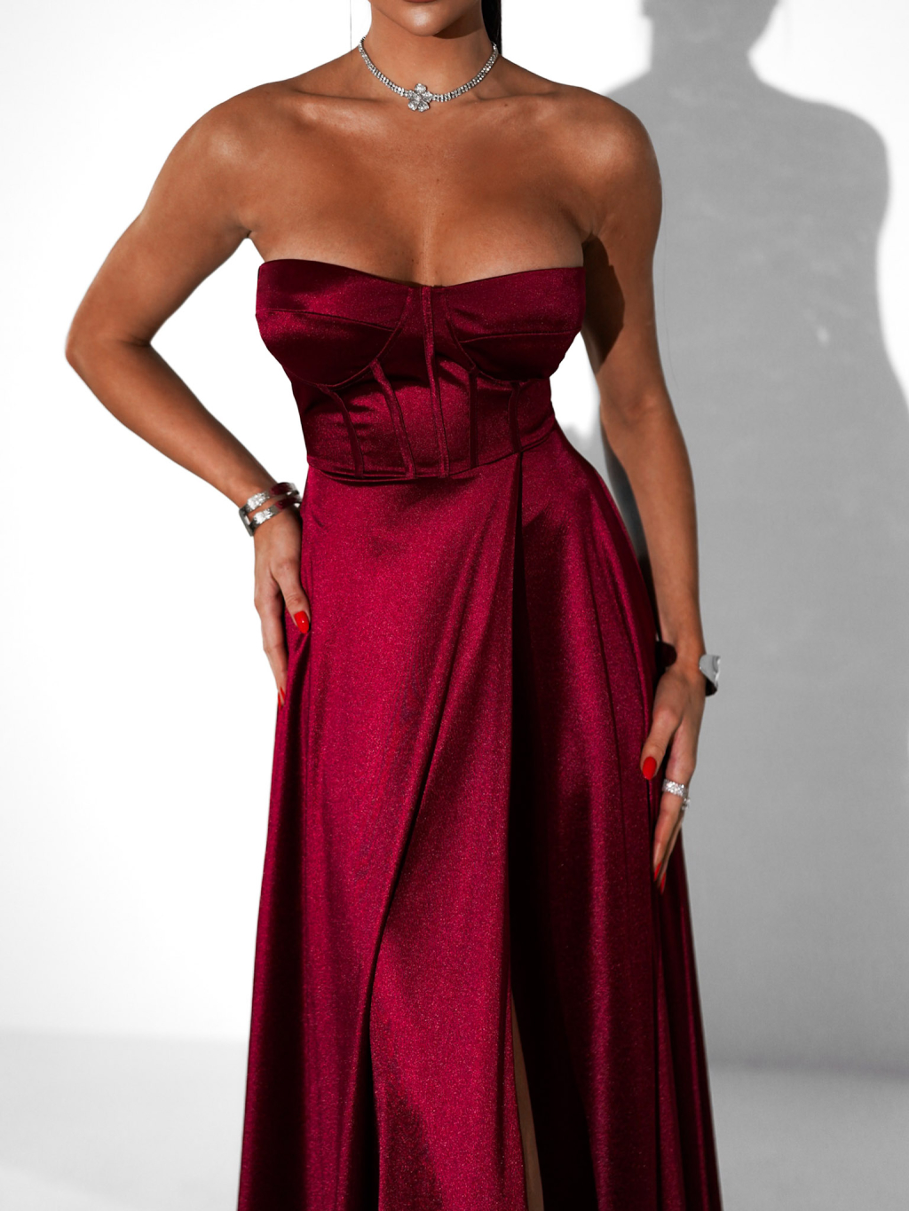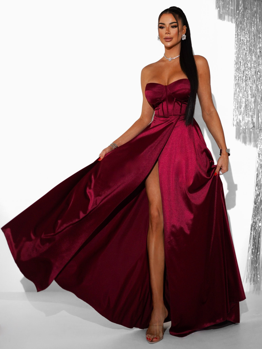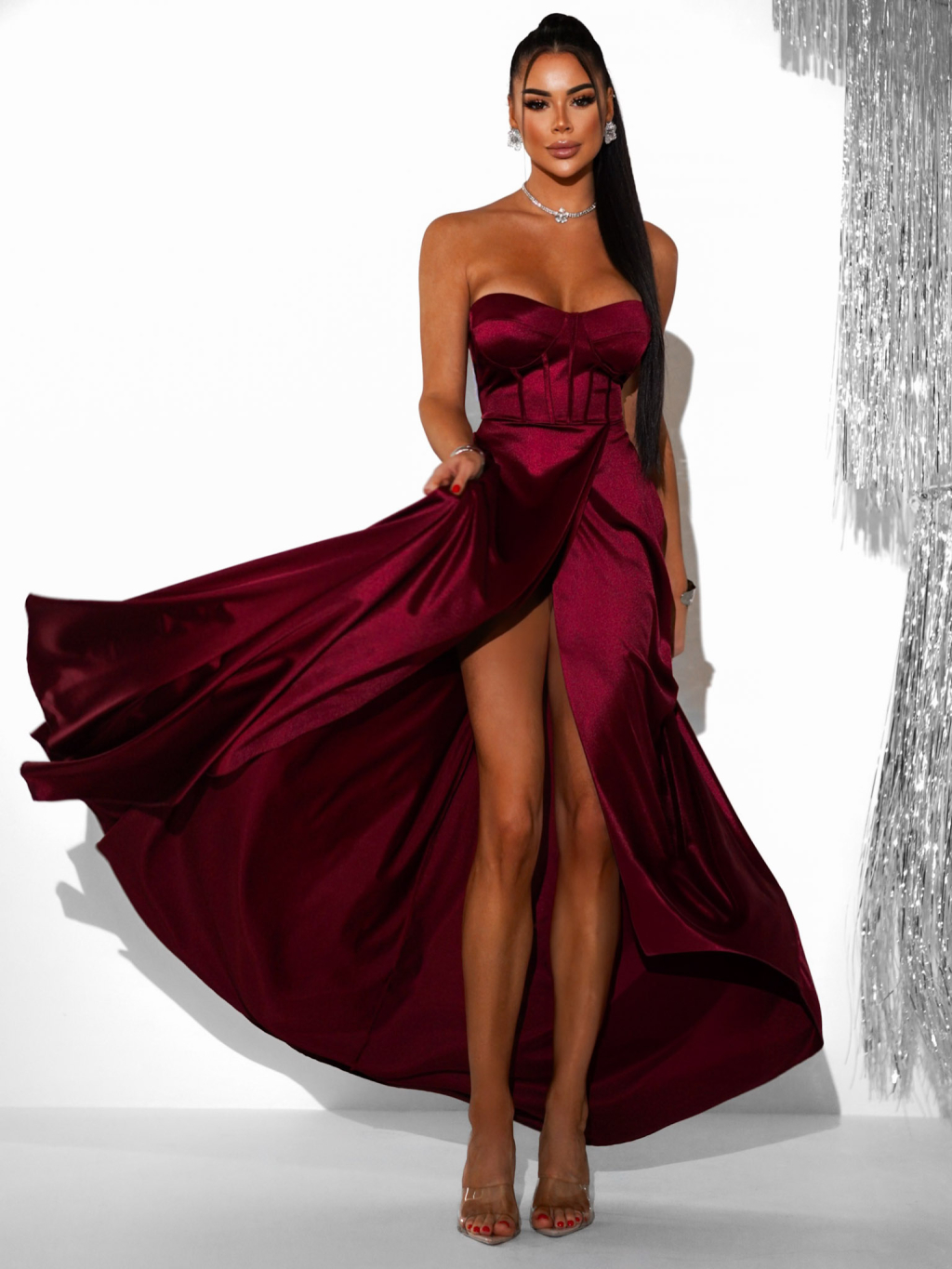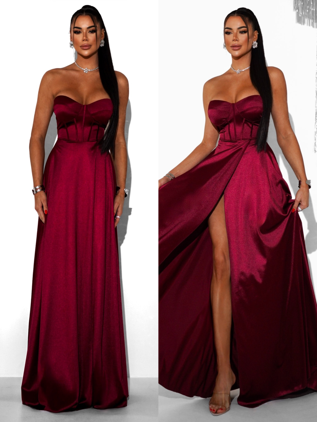 Bordó saténové dlouhé šaty GYBRAL s korzetem