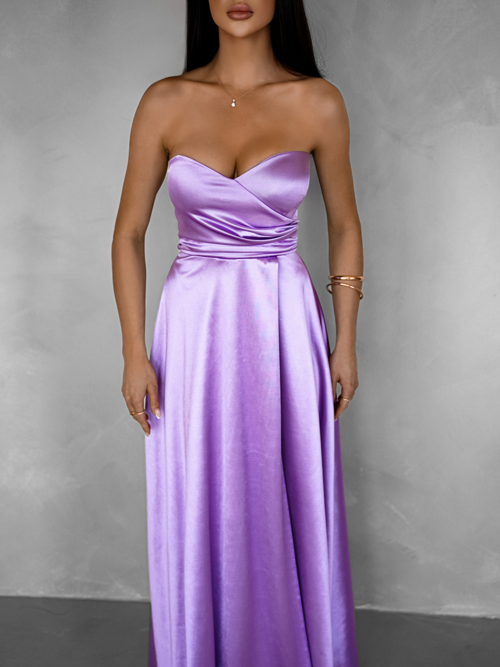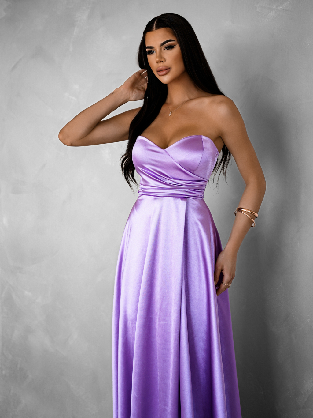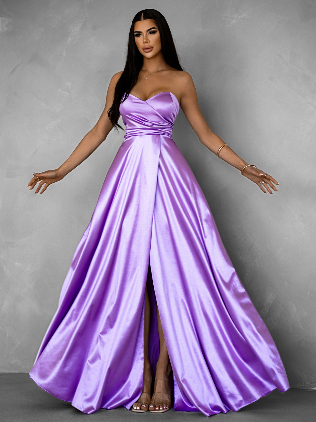 Dopřejte si jedinečný vzhled v saténových společenských šatech, které podtrhnou vaši ženskost a šarm. Šaty mají smyslný střih bez ramínek, jemné řasení v oblasti pasu a výrazný rozparek, který dodává outfitu odvážný i sofistikovaný nádech. Lehký saténový materiál krásně splývá, pohodlně se nosí a působí luxusně. Skvěle se hodí na plesy, večerní akce, svatby či jiné slavnostní příležitosti.
