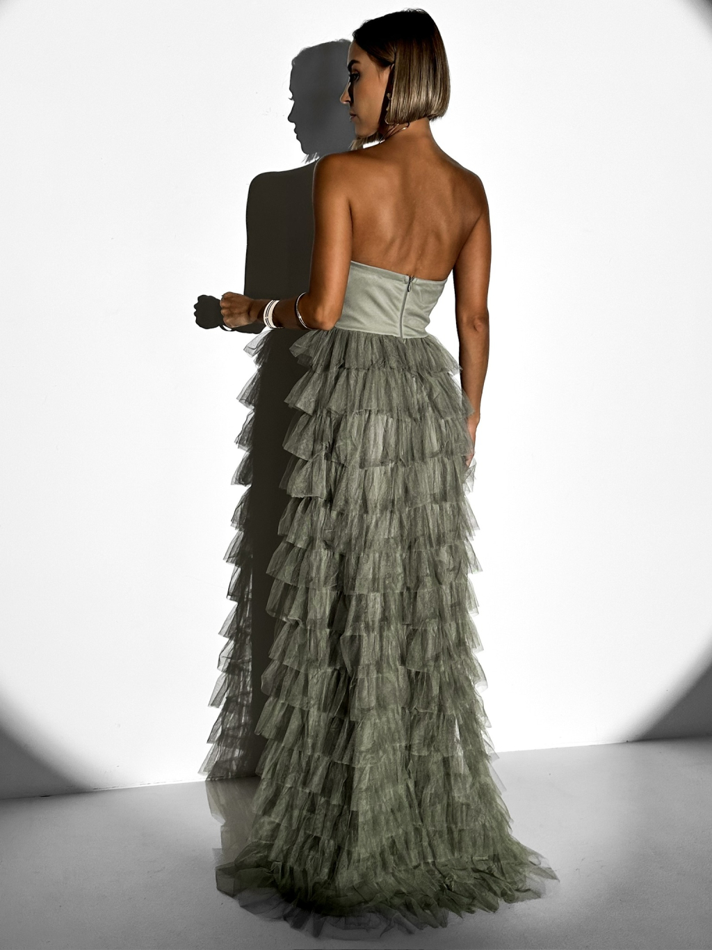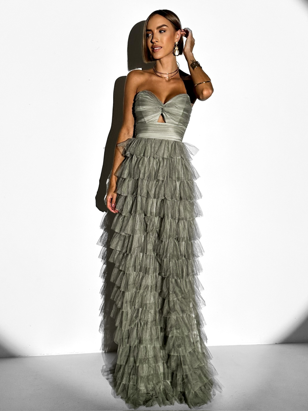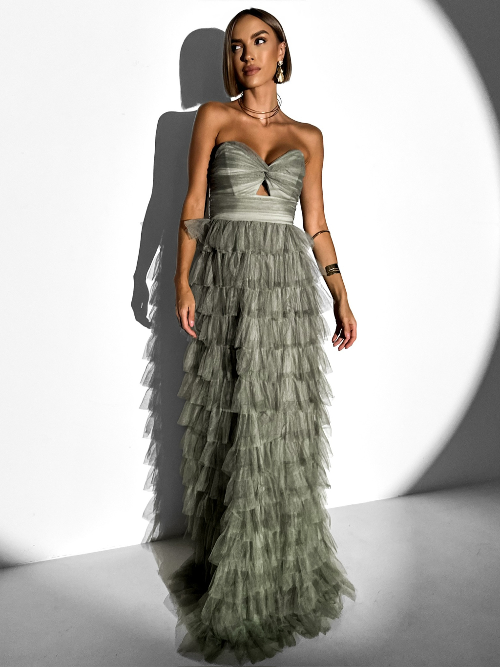 Khaki plesové tylové šaty BRUNHIL s volánky